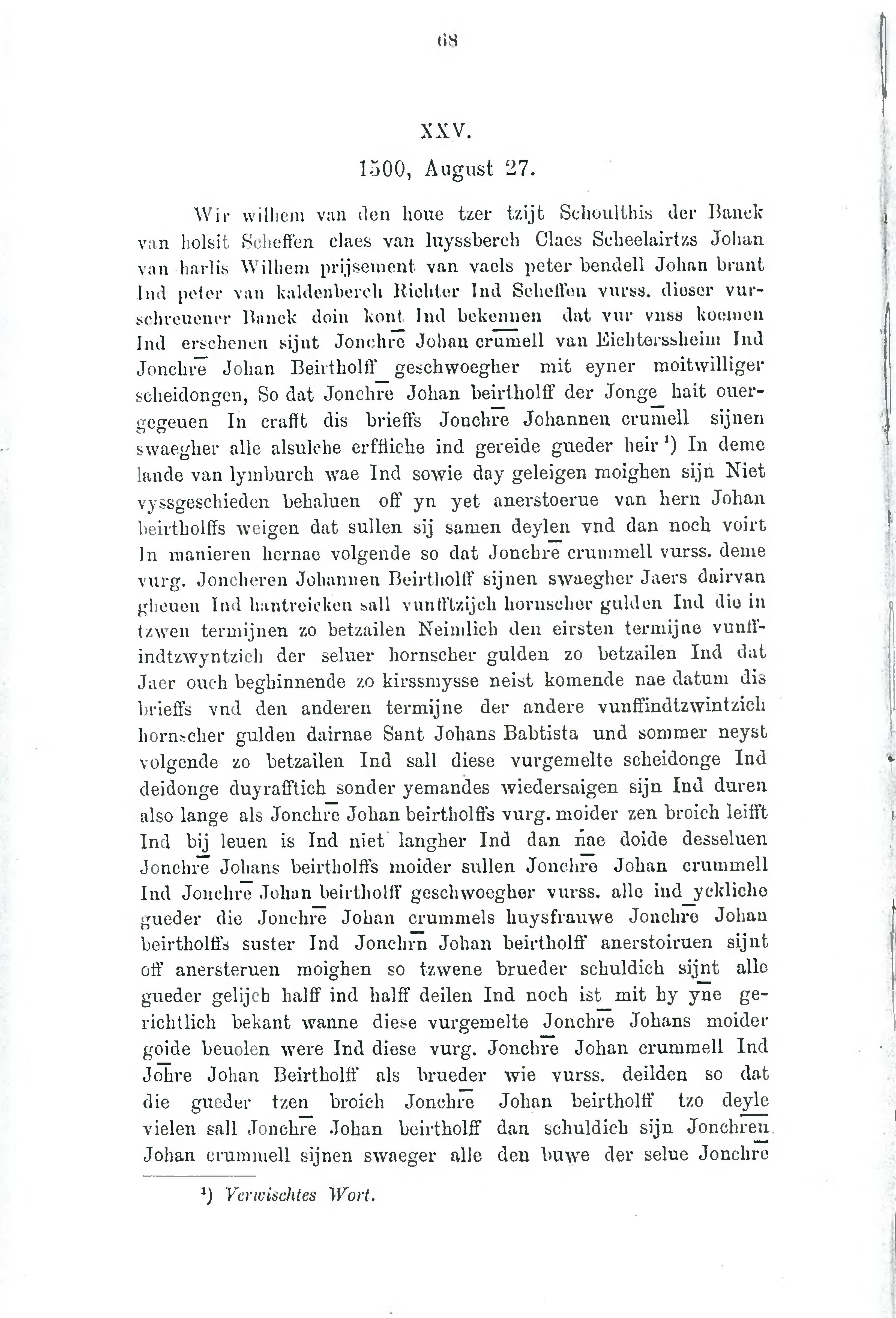 Wir wilhem van den houe tzer tzijt Schoulthis der Banck van holsit Scheffen claes van luyssberch Claes Scheelairtzs Johan van harlis Wilhem prijsement van vaels peter bendell Johan brant Ind peter van kaldenberch Richter Ind Scheffen vurss. dieser vurschreuener Banck doin kont Ind bekennen dat vur vnss koemen Ind ersehenen sijnt Jonchre Johan crumell van Eichterssheim Ind Jonchre Johan Beirtholff geschwoegher mit eyner moitwilliger scheidongen, So dat Jonchre Johan beirtholff der Jonge hait ouergegeuen In crafft dis brieffs Jonchre Johannen crumell sijnen swaegher alle alsulche erffliche ind gereide gueder heir[1] In deme lande van lymburch wae Ind sowie day geleigen moighen sijn Niet vyssgeschieden behaluen off yn yet anerstoerue van hern Johan beirtholffs weigen dat sullen sij samen deylen vnd dan noch voirt In manieren hernae volgende so dat Jonchre crummell vurss. deme vurg. Joncheren Johannen Beirtholff sijnen swaegher Jaers dairvan gheuen Ind hantreicken sall vuntffzijch hornscher gulden Ind die in tzwen termijnen zo betzailen Neimlich den eirsten termijne vunffindtzwyntzich der seluer hornscher gulden zo betzailen Ind dat Jaer ouch beghinnende zo kirssmysse neist komende nae datum dis brieffs vnd den anderen termijne der andere vunffindtzwintzich hornscher gulden dairnae Sant Johans Babtista und sommer neyst volgende zo betzailen Ind sall diese vurgemelte scheidonge Ind deidonge duyrafftich sonder yemandes wiedersaigen sijn Ind duren also lange als Jonchre Johan beirtholffs vurg. moider zen broich leifft Ind bij leuen is Ind niet langher Ind dan nae doide desseluen Jonchre Johans beirtholffs moider sullen Jonchre Johan crummell Ind Jonchre Johan beirtholff geschwoegher vurss. alle ind yckliche gueder die Jonchre Johan crummels huysfrauwe Jonchre Johan beirtholffs suster Ind Jonchrn Johan beirtholff anerstoiruen sijnt off anersteruen moighen so tzwene brueder schuldich sijnt alle gueder gelijch halff ind halff deilen Ind noch ist mit hy yne gerichtlich bekant wanne diese vurgemelte Jonchre Johans moider goide beuolen were Ind diese vurg. Jonchre Johan crummell Ind Johre Johan Beirtholff als brueder wie vurss. deilden so dat die gueder tzen broich Jonchre Johan beirtholff tzo deyle vielen sall Jonchre Johan beirtholff dan schuldich sijn Jonchren Johan crummell sijnen swaeger alle den buwe der selue Jonchre