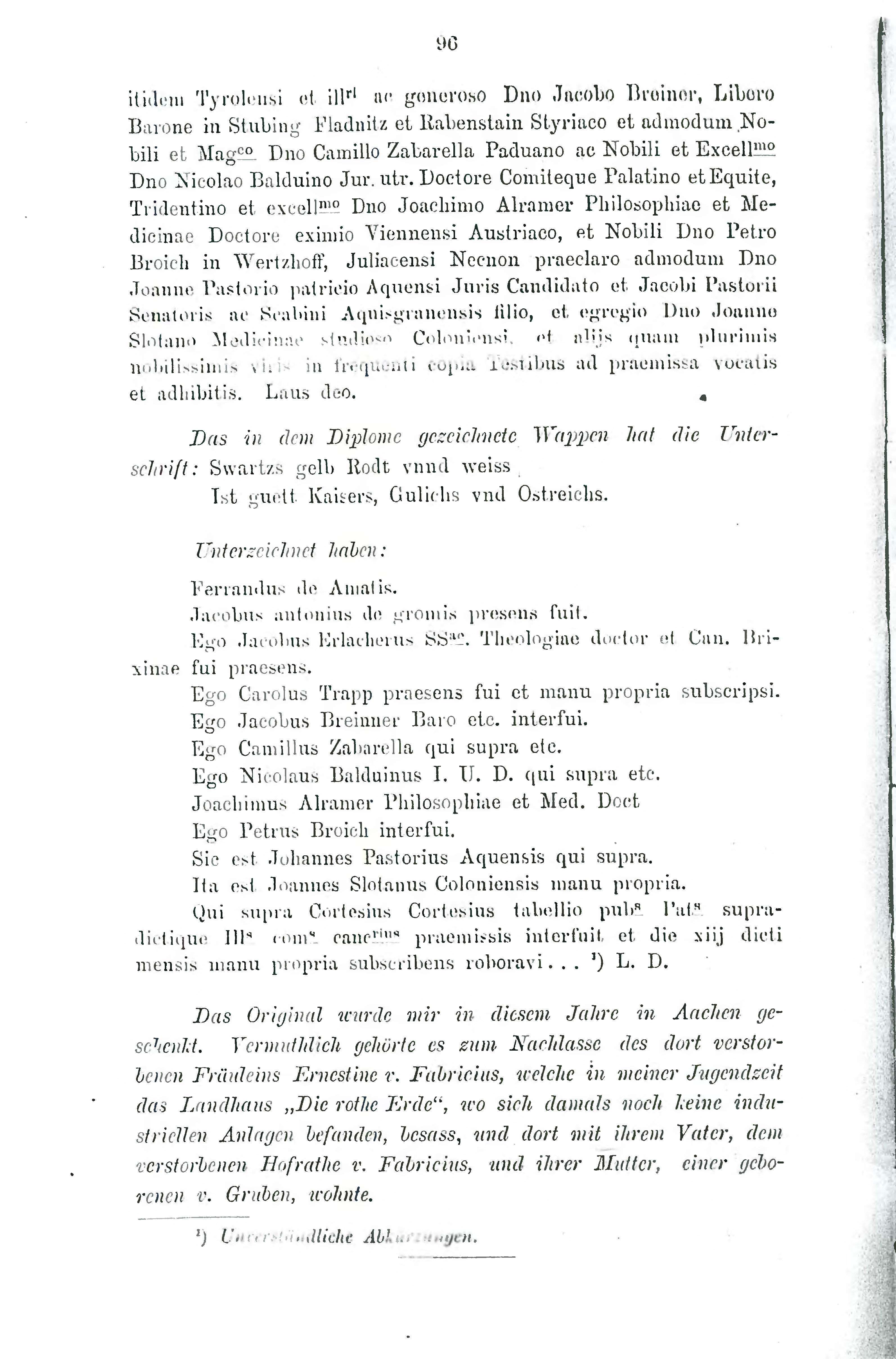 itidm Tyrolensi et illrl ac generoso Dno Jacobo Breiner, Libero Barone in Stubing Fladnitz et Rabenstain Styriaco et admodum Nobili et Magco Dno Camillo Zabarella Paduano ac Nobili et Excellmo Dno Nicolao Balduino Jur. utr. Doctore Comiteque Palatino et Equite, Tridentino et excellmo Dno Joachimo Alramer Philosophiae et Medicinae Doctore eximio Viennensi Austriaco, et Nobili Dno Petro Broich in Wertzhoff, Juliacensi Necnon praeclaro admodum Dno Joanne Pastorio patricio Aquensi Juris Candidato et Jacobi Pastorii Senatoris ac Scabini Aquisgranensis filio, et egregio Dno Joanne Slotano Medicinae studioso Coloniensi, et alijs quam plurimis nobilissimis viris in frequenti copia Testibus ad praemissa vocatis et adhibitis. Laus deo.