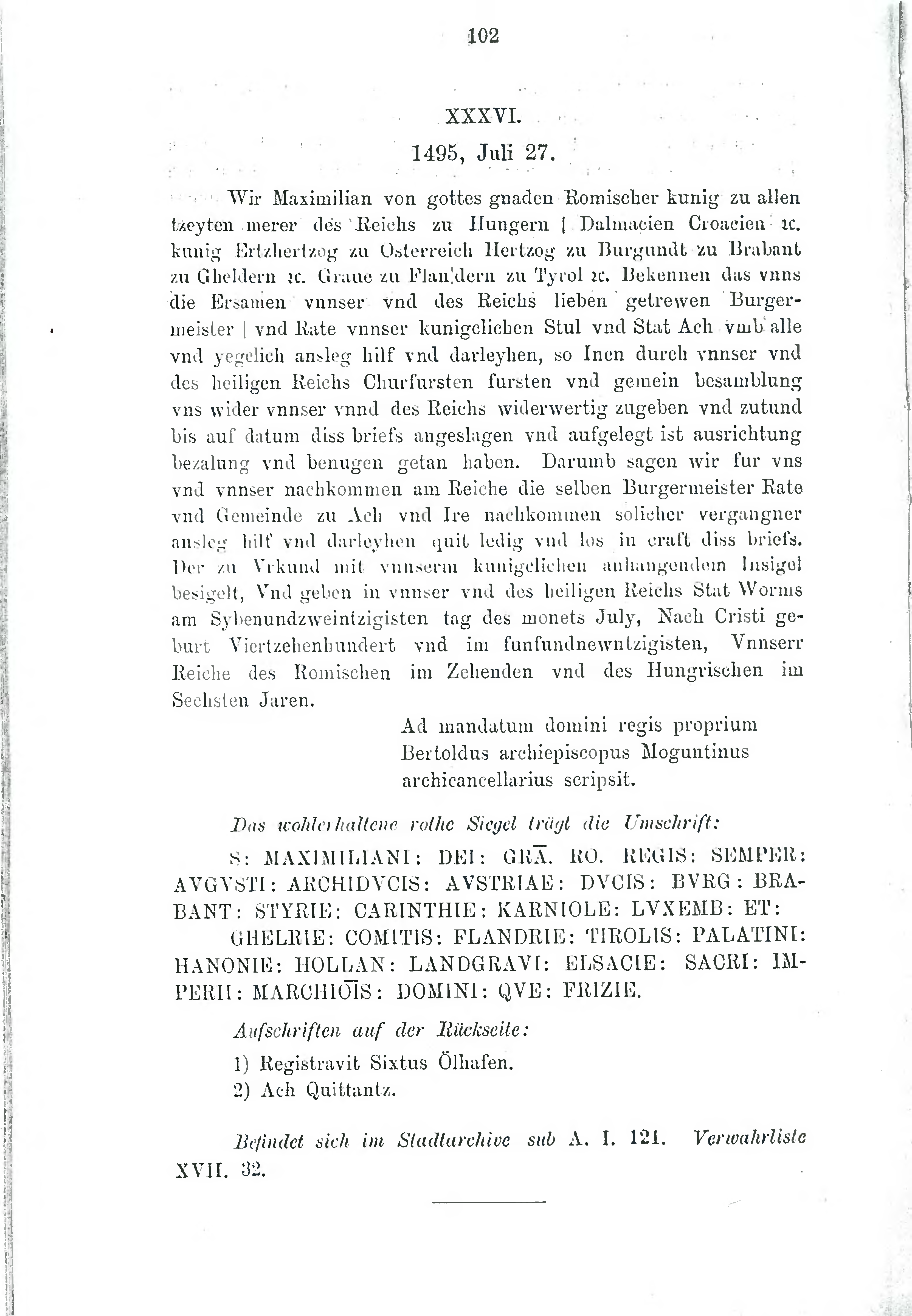 Wir Maximilian von gottes gnaden Romischer kunig zu allen tzeyten merer des Reichs zu Hungern | Dalmacien Croacien ec. kunig Ertzhertzog zu Osterreich Hertzog zu Burgundt zu Brabant zu Gheldern ec. Graue zu Flandern zu Tyrol ec. Bekennen das vnns die Ersamen vnnser vnd des Reichs lieben getrewen Burgermeister | vnd Rate vnnser kunigelichen Stul vnd Stat Ach vmb alle vnd yegelich ansleg hilf vnd darleyhen, so Inen durch vnnser vnd des heiligen Reichs Churfursten fursten vnd gemein besamblung vns wider vnnser vnnd des Reichs widerwertig zugeben vnd zutund bis auf datum diss briefs angeslagen vnd aufgelegt ist ausrichtung bezalung vnd benugen getan haben. Darumb sagen wir fur vns vnd vnnser nachkommen am Reiche die selben Burgermeister Rate vnd Gemeinde zu Ach vnd Ire nachkommen solicher vergangner ansleg hilf vnd darleyhen quit ledig vnd los in craft diss briefs. Der zu Vrkund mit vnnserm kunigelichen anhangendem lnsigel besigelt, Vnd geben in vnnser vnd des heiligen Reichs Stat Worms am Sybenundzweintzigisten tag des monets July, Nach Cristi geburt Viertzehenhundert vnd im funfundnewntzigisten, Ynnserr Reiche des Romischen im Zehenden vnd des Hungrischen im Sechsten Jaren.