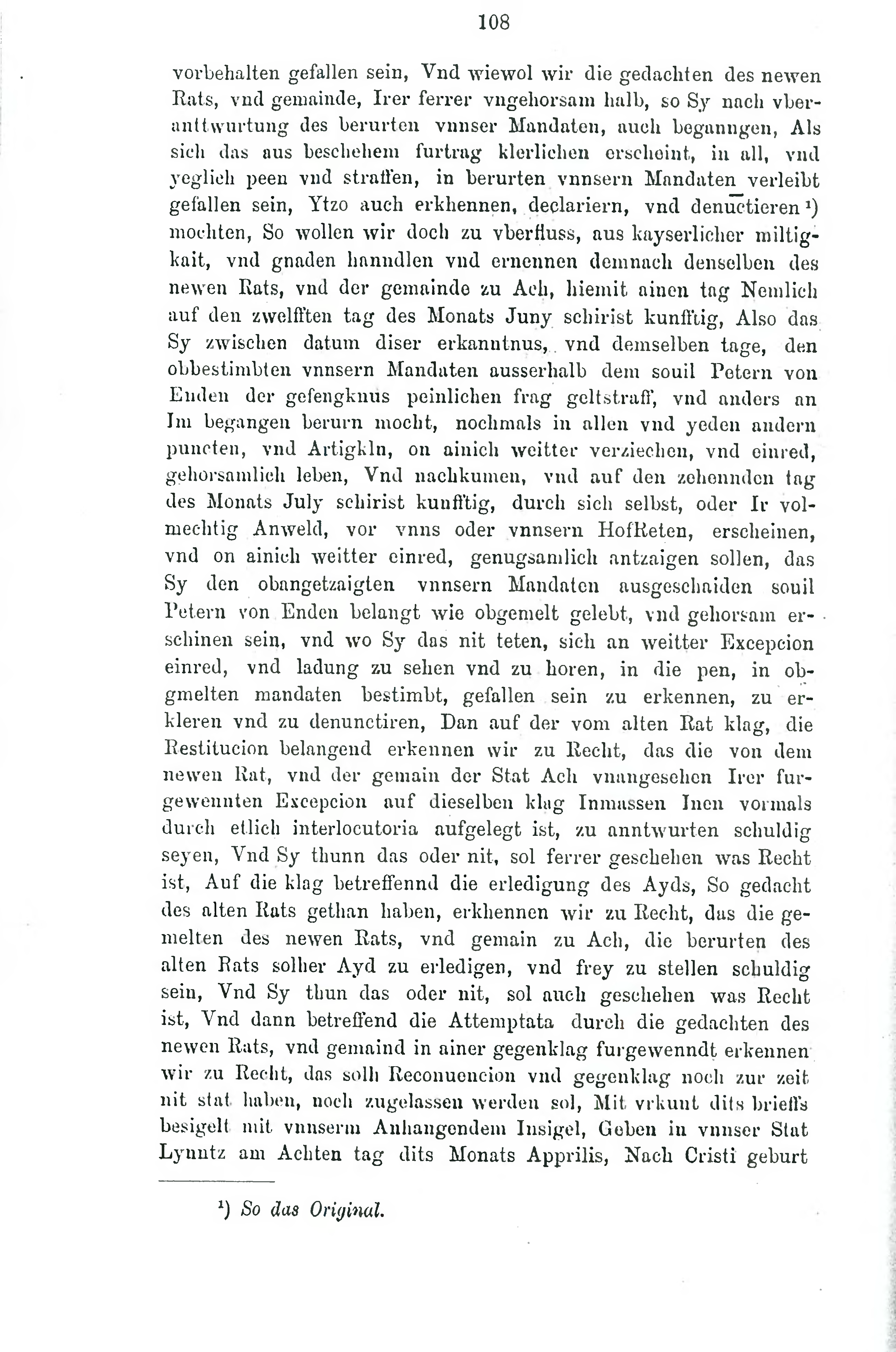 vorbehalten gefallen sein, Vnd wiewol wir die gedachten des newen Rats, vnd gemainde, Irer ferrer vngehorsam halb, so Sy nach vberanttwurtung des berurten vnnser Mandaten, auch beganngen, Als sich das aus beschehem furtrag klerlichen erscheint, in all, vnd yeglich peen vnd straffen, in berurten vnnsern Mandaten verleibt gefallen sein, Ytzo auch erkhennen, declariern, vnd denuctieren[1] mochten, So wollen wir doch zu vberfluss, aus kayserlicher miltigkait, vnd gnaden hanndlen vnd ernennen demnach denselben des newen Rats, vnd der gemainde zu Ach, hiemit amen tag Nemlich auf den zwelfften tag des Monats Juny schirist kunfftig, Also das Sy zwischen datum diser erkanntnus, vnd demselben tage, den obbestimbten vnnsern Mandaten ausserhalb dem souil Petern von Enden der gefengknus peinlichen frag geltstraff, vnd anders an Im begangen berurn mocht, nochmals in allen vnd yeden andern puncten, vnd Artigkln, on ainich weitter verziechen, vnd einred, gehorsamlich leben, Vnd nachkumen, vnd auf den zehennden tag des Monats July schirist kunfftig, durch sich selbst, oder Ir volmechtig Anweld, vor vnns oder vnnsern HofReten, erscheinen, vnd on ainich weitter einred, genugsamlich antzaigen sollen, das Sy den obangetzaigten vnnsern Mandaten ausgeschaiden souil Petern von Enden belangt wie obgemelt gelebt, vnd gehorsam erschinen sein, vnd wo Sy das nit teten, sich an weitter Excepcion einred, vnd ladung zu sehen vnd zu horen, in die pen, in obgmelten mandaten bestimbt, gefallen sein zu erkennen, zu erkleren vnd zu denunctiren, Dan auf der vom alten Rat klag, die Restitucion belangend erkennen wir zu Recht, das die von dem newen Rat, vnd der gemain der Stat Ach vnangesehen Irer furgewennten Excepcion auf dieselben klag Inmassen Inen vormals durch etlich interlocutoria aufgelegt ist, zu anntwurten schuldig seyen, Vnd Sy thunn das oder nit, sol ferrer geschehen was Recht ist, Auf die klag betreffennd die erledigung des Ayds, So gedacht des alten Rats gethan haben, erkhennen wir zu Recht, das die gemelten des newen Rats, vnd gemain zu Ach, die berurten des alten Rats solher Ayd zu erledigen, vnd frey zu stellen schuldig sein, Vnd Sy thun das oder nit, sol auch geschehen was Recht ist, Vnd dann betreffend die Attemptata durch die gedachten des newen Rats, vnd gemaind in ainer gegenklag furgewenndt erkennen wir zu Recht, das solh Reconuencion vnd gegenklag noch zur zeit nit stat haben, noch zugelassen werden sol, Mit vrkuut dits brieffs besigelt mit vnnserm Anhangendem Insigel, Geben in vnnser Stat Lynntz am Achten tag dits Monats Apprilis, Nach Cristi geburt