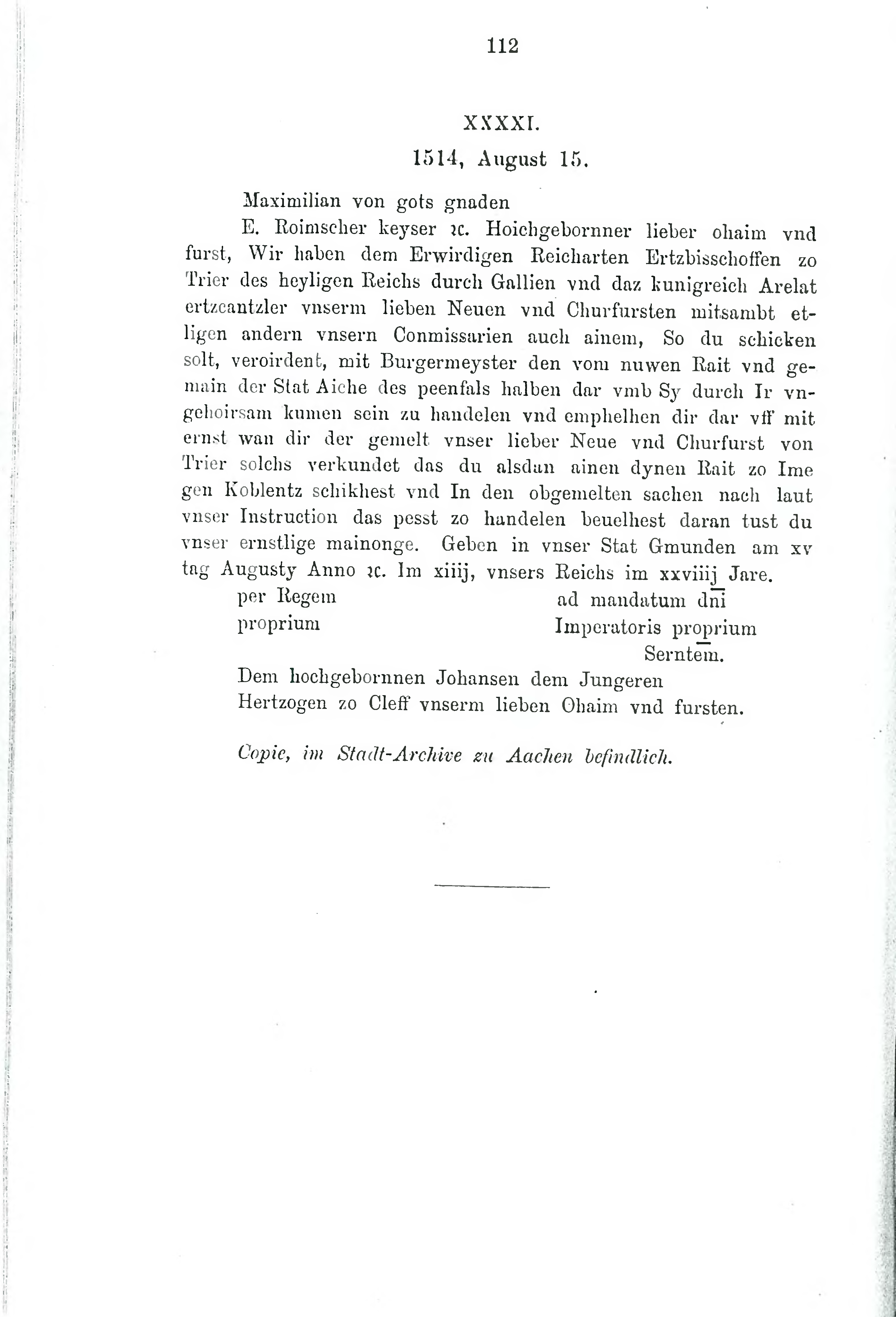 E. Roimscher keyser ec. Hoichgebornner lieber ohaim vnd furst, Wir haben dem Erwirdigen Reicharten Ertzbisschoffen zo Trier des heyligen Reichs durch Gallien vnd daz kunigreich Arelat ertzcantzler vnserm lieben Neuen vnd Churfursten mitsambt etligen andern vnsern Conmissarien auch ainem, So du schicken solt, veroirdent, mit Burgermeyster den vom nuwen Rait vnd gemain der Stat Aiche des peenfals halben dar vmb Sy durch Ir vngehoirsam kumen sein zu handelen vnd emphelhen dir dar vff mit ernst wan dir der gemelt vnser lieber Neue vnd Churfurst von Trier solchs verkundet das du alsdan ainen dynen Rait zo Ime gen Koblentz schikhest vnd In den obgemelten sachen nach laut vnser Instruction das pesst zo handelen beuelhest daran tust du vnser ernstlige mainonge. Geben in vnser Stat Gmunden am xv tag Augusty Anno ec. Im xiiij, vnsers Reichs im xxviiij Jare.