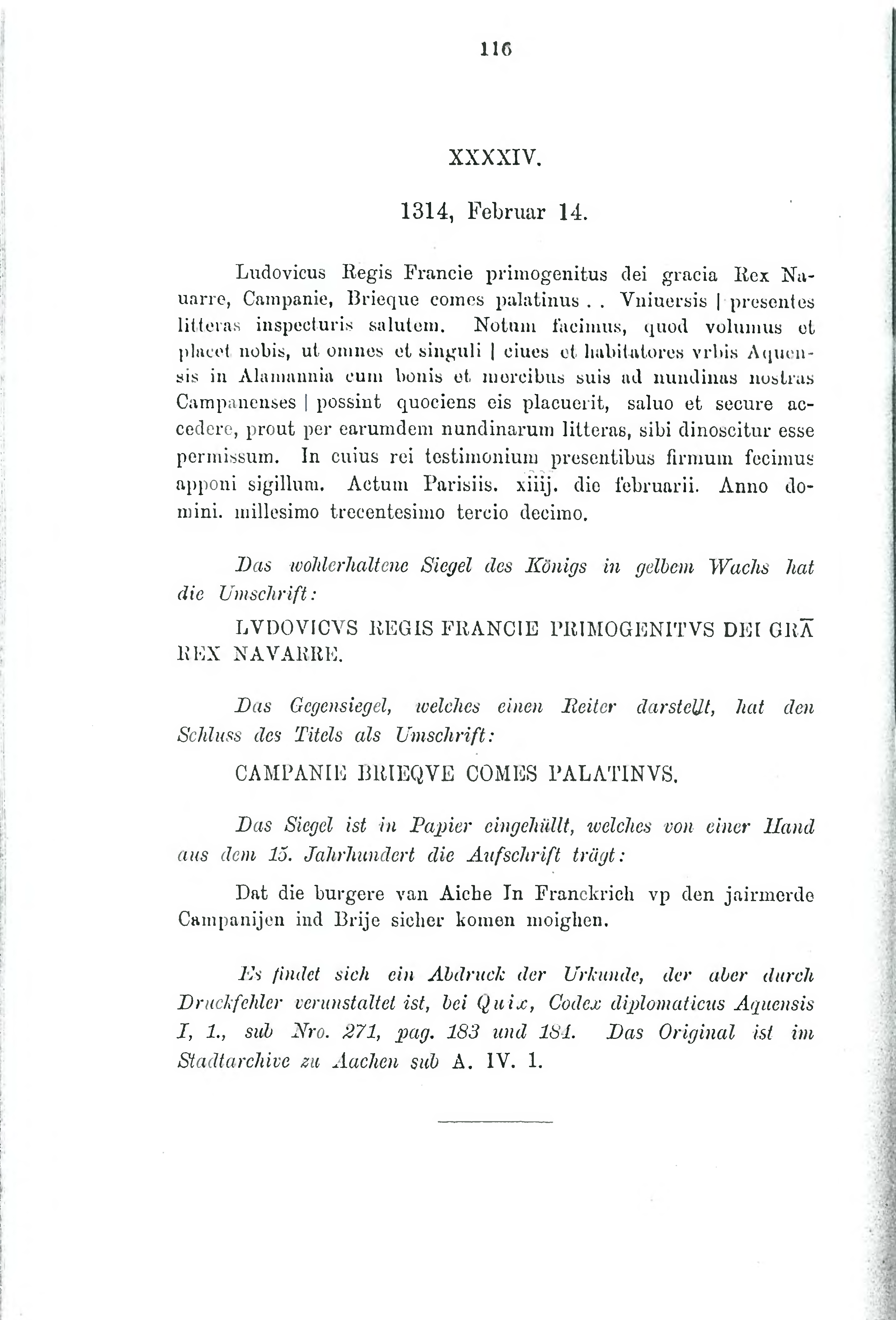 Ludovicus Regis Francie primogenitus dei gracia Rex Nauarre, Campanie, Brieque comes palatinus . . Vniuersis | presentes litteras inspecturis salutem. Notum facimus, quod volumus et placet nobis, ut omnes et singuli | eiues et habitatores vrbis Aquensis in Alamannia cum bonis et mercibus suis ad nundinas nostras Campanenses | possint quociens eis placuerit, saluo et secure accedere, prout per earumdem nundinarum litteras, sibi dinoscitur esse permissum. In cuius rei testimonium presentibus firmum fecimus apponi sigillum. Actum Parisiis. xiiij. die februarii. Anno domini. millesimo trecentesimo tercio decimo.