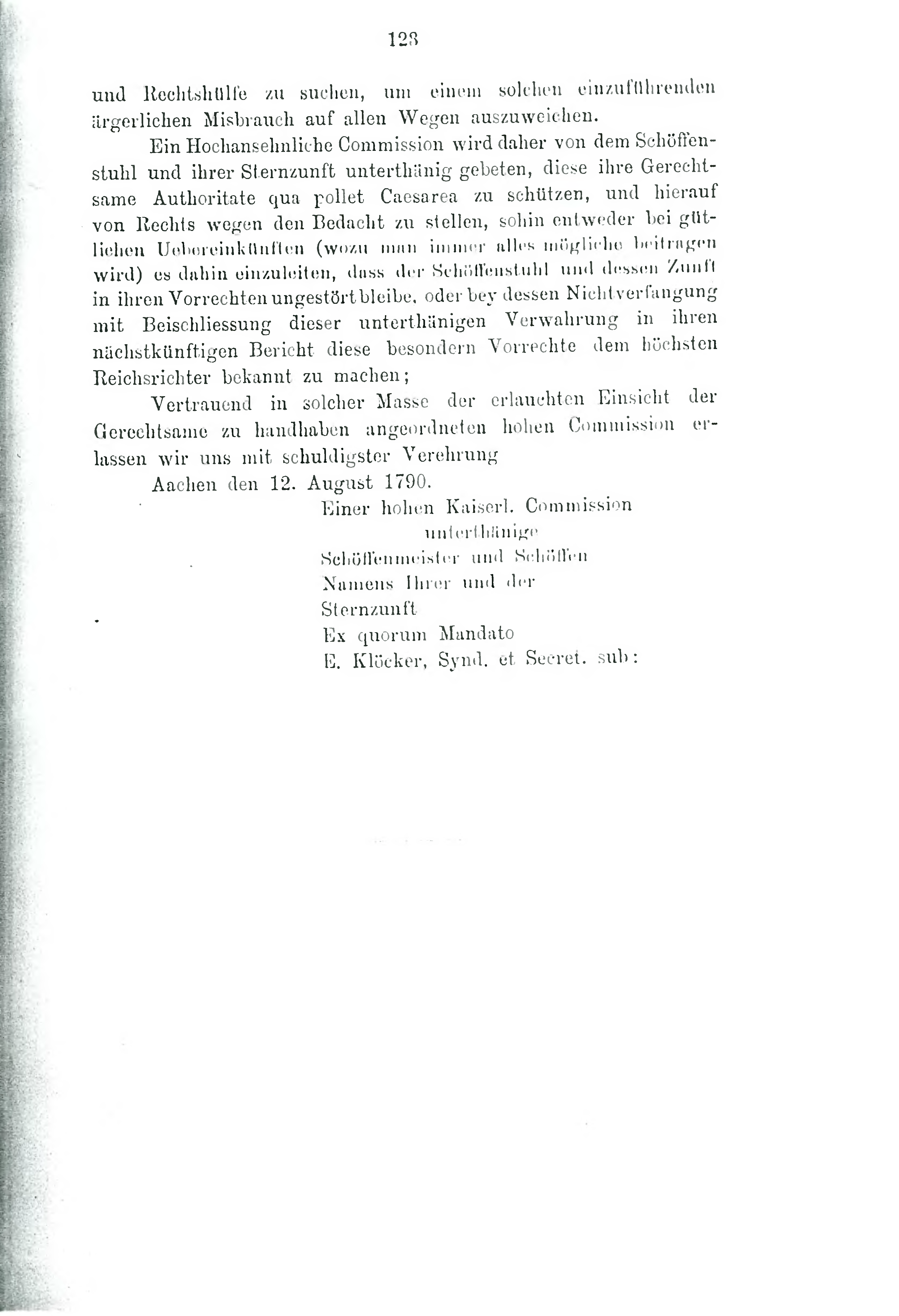 Ein Hochansehnliche Commission wird daher von dem Schöffenstuhl und ihrer Sternzunft unterthänig gebeten, diese ihre Gerechtsame Authoritate qua pollet Caesarea zu schützen, und hierauf von Rechts wegen den Bedacht zu stellen, sohin entweder bei gütlichen Uebereinkünften (wozu man immer alles mögliche beitragen wird) es dahin einzuleiten, dass der Schöffenstuhl und dessen Zunft in ihren Vorrechten ungestört bleibe, oder bey dessen Nichtverfangung mit Beischliessung dieser unterthänigen Verwahrung in ihren nächstkünftigen Bericht diese besondern Vorrechte dem höchsten Reichsrichter bekannt zu machen;