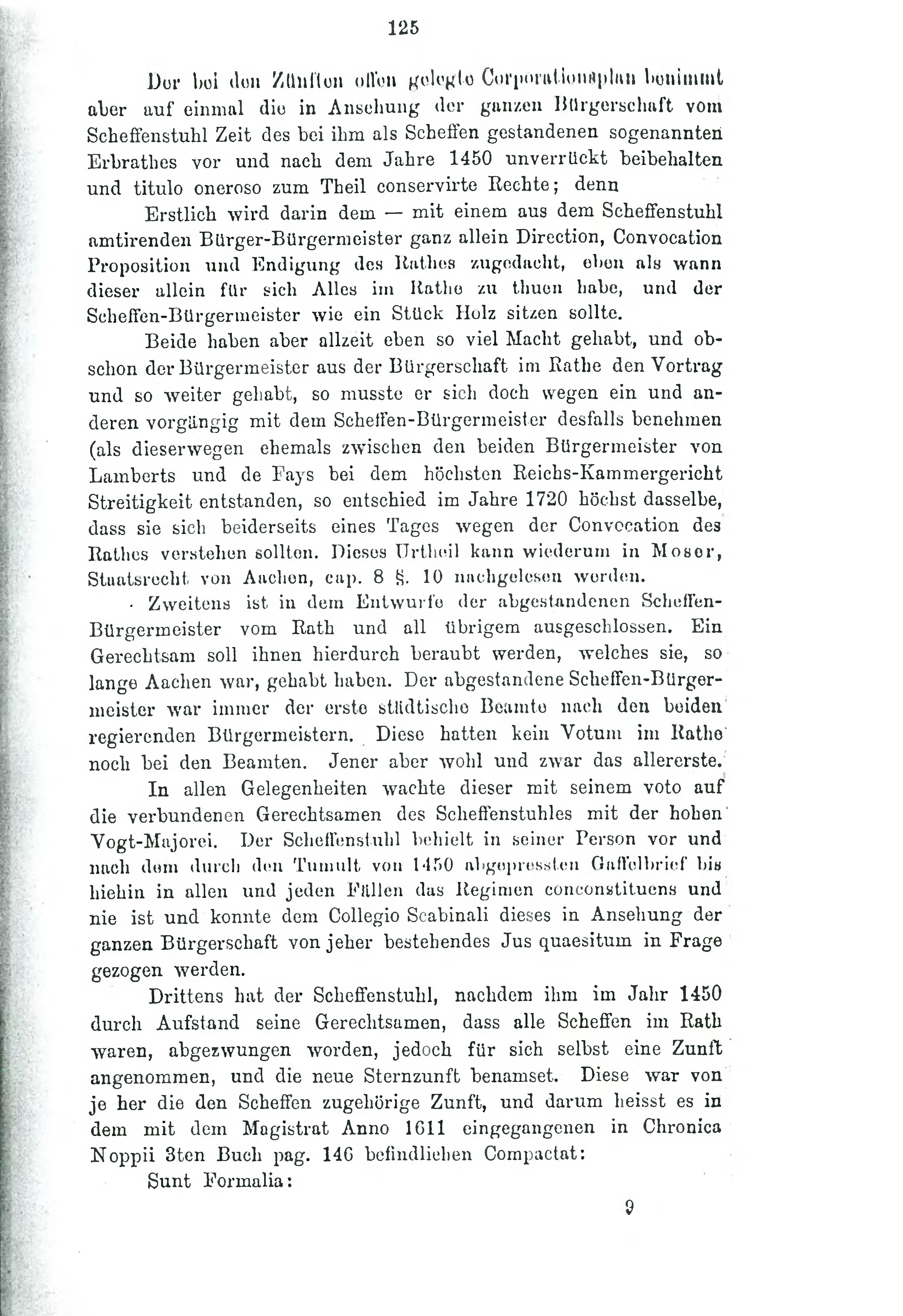 Beide haben aber allzeit eben so viel Macht gehabt, und obschon der Bürgermeister aus der Bürgerschaft im Rathe den Vortrag und so weiter gehabt, so musste er sich doch wegen ein und anderen vorgängig mit dem Scheffen-Bürgermeister desfalls benehmen (als dieserwegen ehemals zwischen den beiden Bürgermeister von Lamberts und de Fays bei dem höchsten Reichs-Karnmergericht Streitigkeit entstanden, so entschied im Jahre 1720 höchst dasselbe, dass sie sich beiderseits eines Tages wegen der Convocation des Rathes verstehen sollten. Dieses Urtheil kann wiederum in Moser, Staatsrecht von Aachen, cap. 8 §. 10 nachgelesen worden.