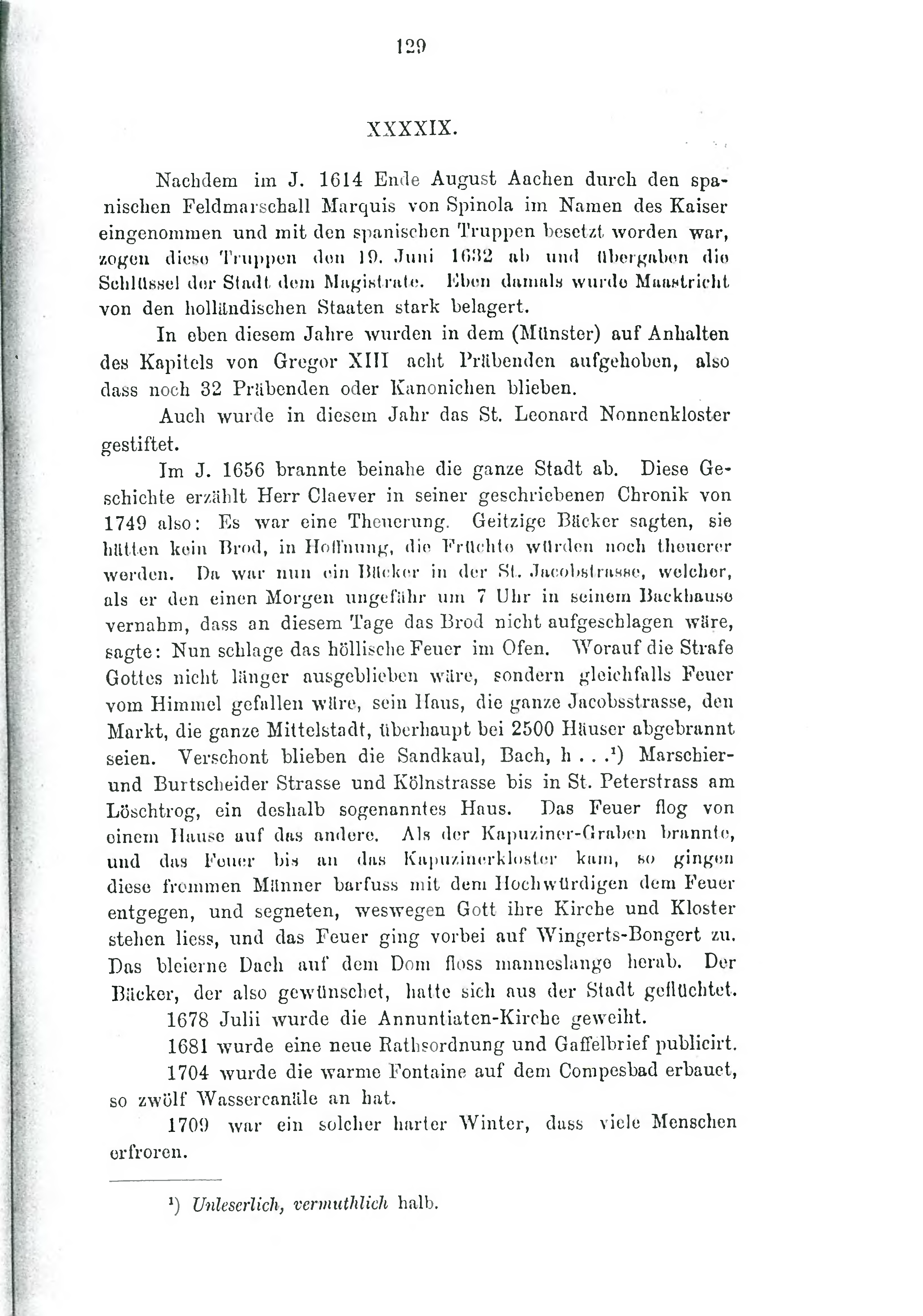 Im J. 1656 brannte beinahe die ganze Stadt ab. Diese Geschichte erzählt Herr Claever in seiner geschriebenen Chronik von 1749 also: Es war eine Theuerung, Geitzige Bäcker sagten, sie hätten kein Brod, in Hoffnung, die Früchte würden noch theuerer werden. Da war nun ein Bäcker in der St. Jacobstrasse, welcher, als er den einen Morgen ungefähr um 7 Uhr in seinem Backhause vernahm, dass an diesem Tage das Brod nicht aufgeschlagen wäre,sagte: Nun schlage das höllische Feurer im Ofen. Worauf die Strafe Gottes nicht länger ausgeblieben wäre, sondern gleichfalls Feuer vom Himmel gefallen wäre, sein Haus, die ganze Jacobstrasse, den Markt, doe ganze Mittelstadt, überhaupt 2500 Häuser abgebrannt seien. Verschont blieben die Sandkaul, Bach, h...[1] Marschier- und Burtscheider Strasse und Kölnstrasse bis in St. Peterstrass am Löschtrog, ein deshalb sogenanntes Haus, Das Feuer flog von einem Hause auf das andere. Als der Kapuziner-Graben brannte, und das Feuer bis an dea Kapuzinerkloster kam, so gingen dies frommen Männer barfuss mit dem Hochwürdigen dem Feuer entgegen, und segneten, weswegen Gott ihre Kirche und Kloster stehen liess, und das Feuer ging vorbei auf Wingerts-Bongert zu. Bas bleierne Dach auf dem Dom floss manneslang herab. Der Bäcker, der also gewünschet, hatte sich aus der Stadt geflüchtet.
