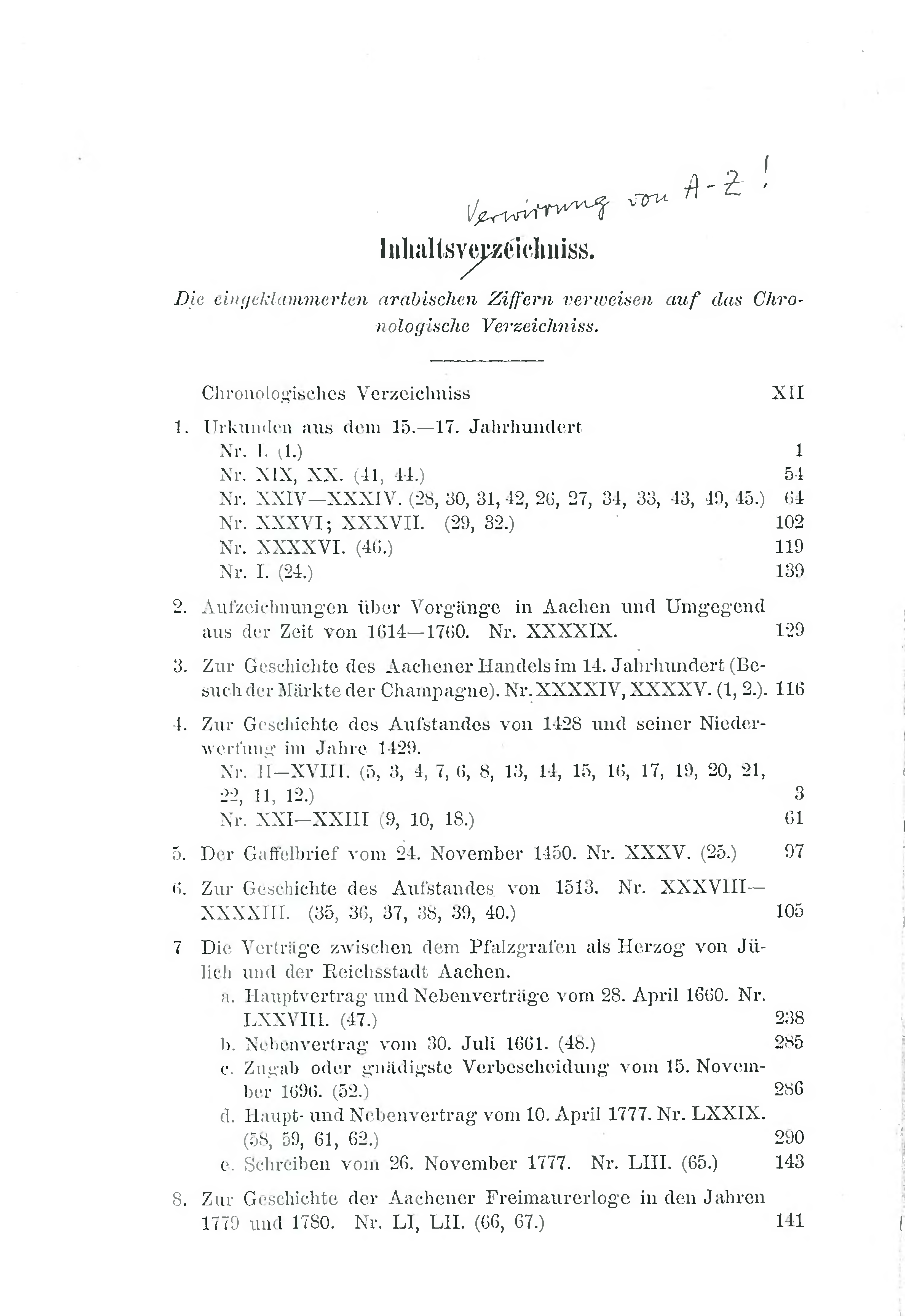 Beiträge und Material zur Geschichte der Aachener Patrizier-Familien, 1. Band/Inhaltsverzeichnis