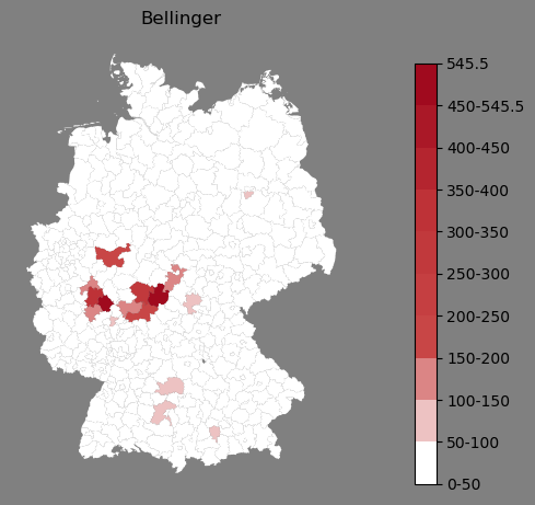 Absolute Verteilung des Namens Bellinger (1890)Direkt zur Karte Absolute Verteilung des Namens "Bellinger" um 1890 im damaligen Deutschen Reich Sie können die Karte innerhalb des Fensters zoomen und verschieben. |