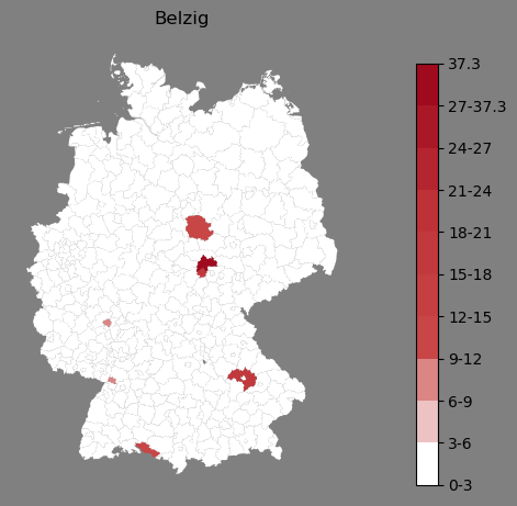 Relative Verteilung des Namens Belzig (1996)Direkt zur Karte Die Farbskala zeigt die Anzahl von "Belzig" bezogen auf je 1 Million Einträge. |