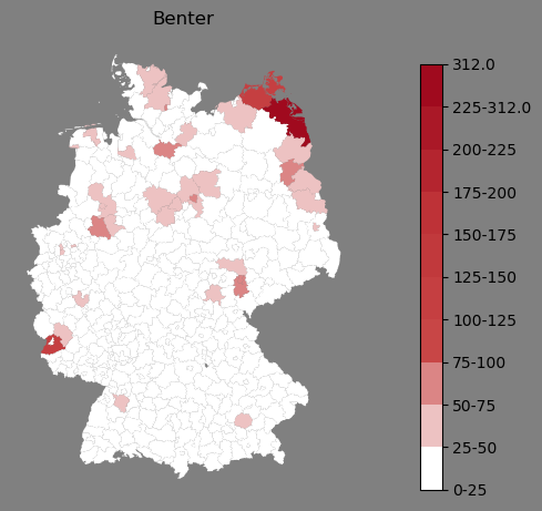 Relative Verteilung des Namens Benter (1996)Direkt zur Karte Die Farbskala zeigt die Anzahl von "Benter" bezogen auf je 1 Million Einträge. |