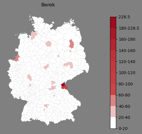 Absolute Verteilung des Namens Berek (1890)Direkt zur Karte Absolute Verteilung des Namens "Berek" um 1890 im damaligen Deutschen Reich Sie können die Karte innerhalb des Fensters zoomen und verschieben. |