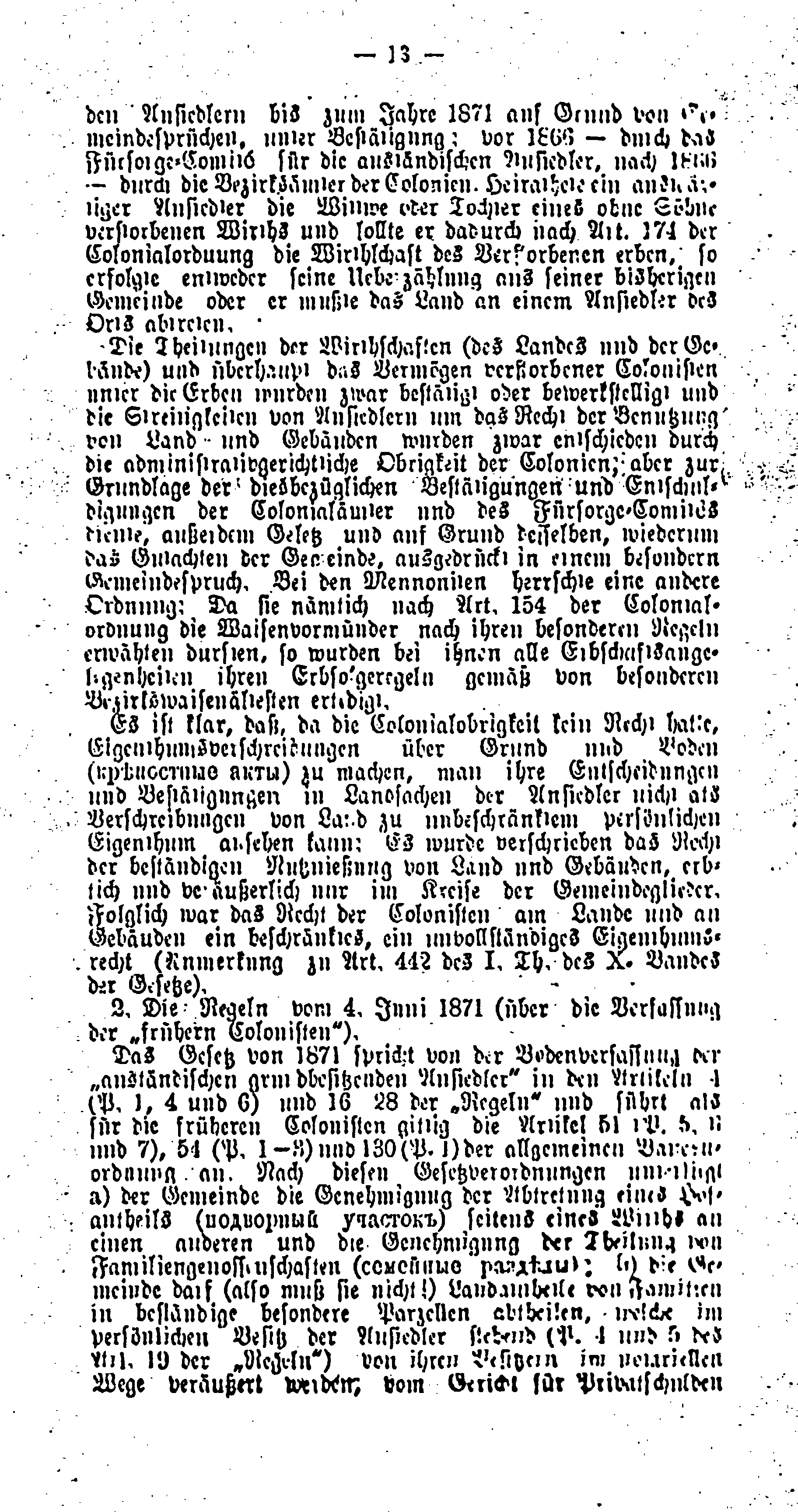 Das Gesetz von 1871 spricht von der Bodenverfassung der „ausländischen grundbesitzenden Ansiedler“ in den Artikeln 4 (P. 1, 4 und 6) und 16 28 der „Regeln“ und führt als für die früheren Colonisten gültig die Artikel 51 (P. 5, 6 und 7), 54 (P. 1-3) und 130 (P. 1) der allgemeinen Bodenordnung an. Nach diesen Gesetzverordnungen unterliegt a) der Gemeinde die Genehmigung der Abtretung eines Hofantheils (подворный участокъ) sietens eines Wirths an einen anderen und die Genehmigung der Theilung von Familiengenossenschaften (семейные раздѣлы); b) die Gemeinde darf (also muß sie nicht!) Landantheile von Familien in beständige besondere Parzellen abtheilen, welche im persönlichen Besitz der Ansiedler stehend (P. 4 und 5 des Art. 19 der „Regeln“) von ihren Besitzern im notariellen Wege veräußert werden, vom Gericht für Privatschulden