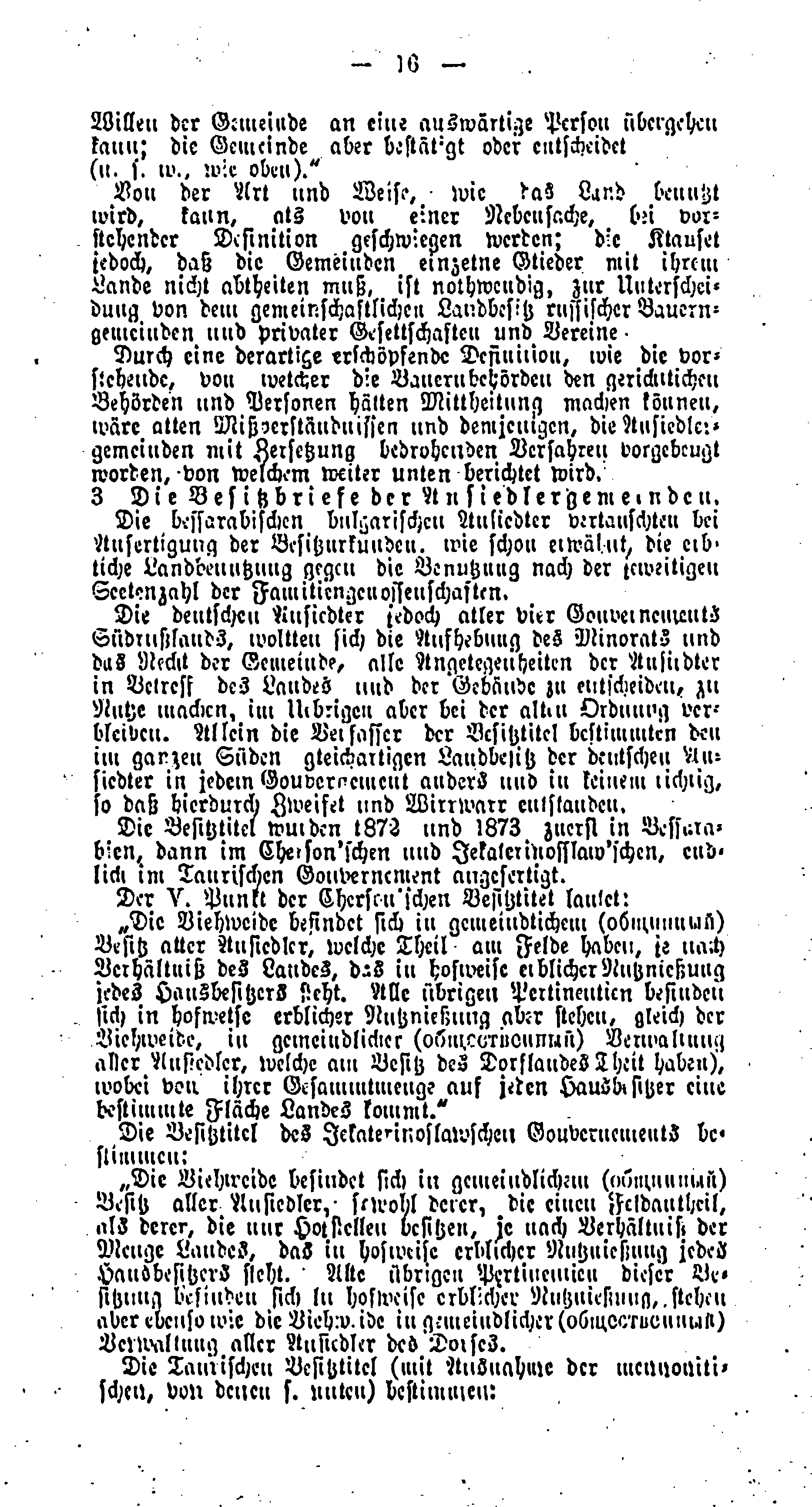 Die deutschen Ansiedler jedoch aller vier Gouvernements Südrußlands, wollten sich die Aufhebung des Minorats und das Recht der Gemeinde, alle Angelegenheiten der Ansiedler in Betreff des Landes und der Gebäude zu entscheiden, zu Nutze machen, im Uebrigen aber bei der alten Ordnung verbleiben. Allein die Verfasser der Besitztitel bestimmten den im ganzen Süden gleichartigen Landbesitz der deutschen Ansiedler in jedem Gouvernement anders und in keinem richtig, so daß hierdurch Zweifel und Wirrwarr entstanden.