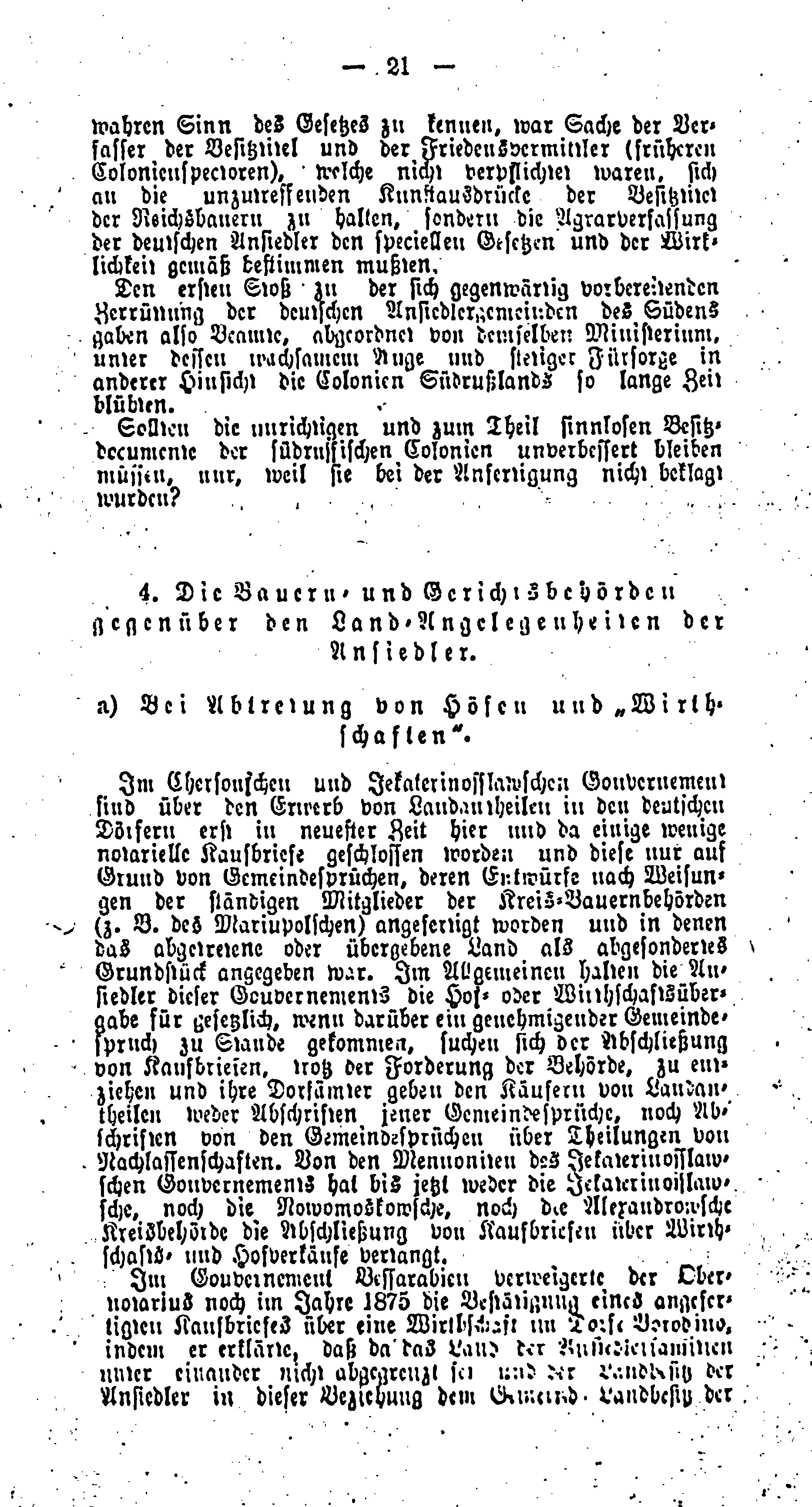 Im Chersonschen und Jekaterinosslawschen Gouvernement sind über den Erwerb von Landantheilen in den deutschen Dörfern erst in neuester Zeit hier und da einige wenige notarielle Kaufbriefe geschlossen worden und diese nur auf Grund von Gemeindesprüchen, deren Entwürfe nach Weisungen der ständigen Mitglieder der Kreis-Bauernbehörden (z. B. des Mariupolschen) angefertigt worden und in denen das abgetretene oder übergebene Land als abgesondertes Grundstück angegeben war. Im Allgemeinen halten die Ansiedler dieser Gouvernements die Hof- oder Wirthschaftsübergabe für gesetzlich, wenn darüber ein genehmigender Gemeindespruch zu Stande gekommen, suchen sich der Abschließung von Kaufbriefen, trotz der Forderung der Behörde, zu entziehen und ihre Dorfämter geben den Käufern von Landantheilen weder Abschriften jener Gemeindesprüche, noch Abschriften von den Gemeindesprüchen über Theilungen von Nachlassenschaften. Von den Mennoniten des Jekaterinosslawschen Gouvernements hat bis jetzt weder die Jekaterinosslawsche, noch die Novomoskowsche, noch die Alexandrowsche Kreisbehörde die Abschließung von Kaufbriefen über Wirthschafts- und Hofverkäufe verlangt.