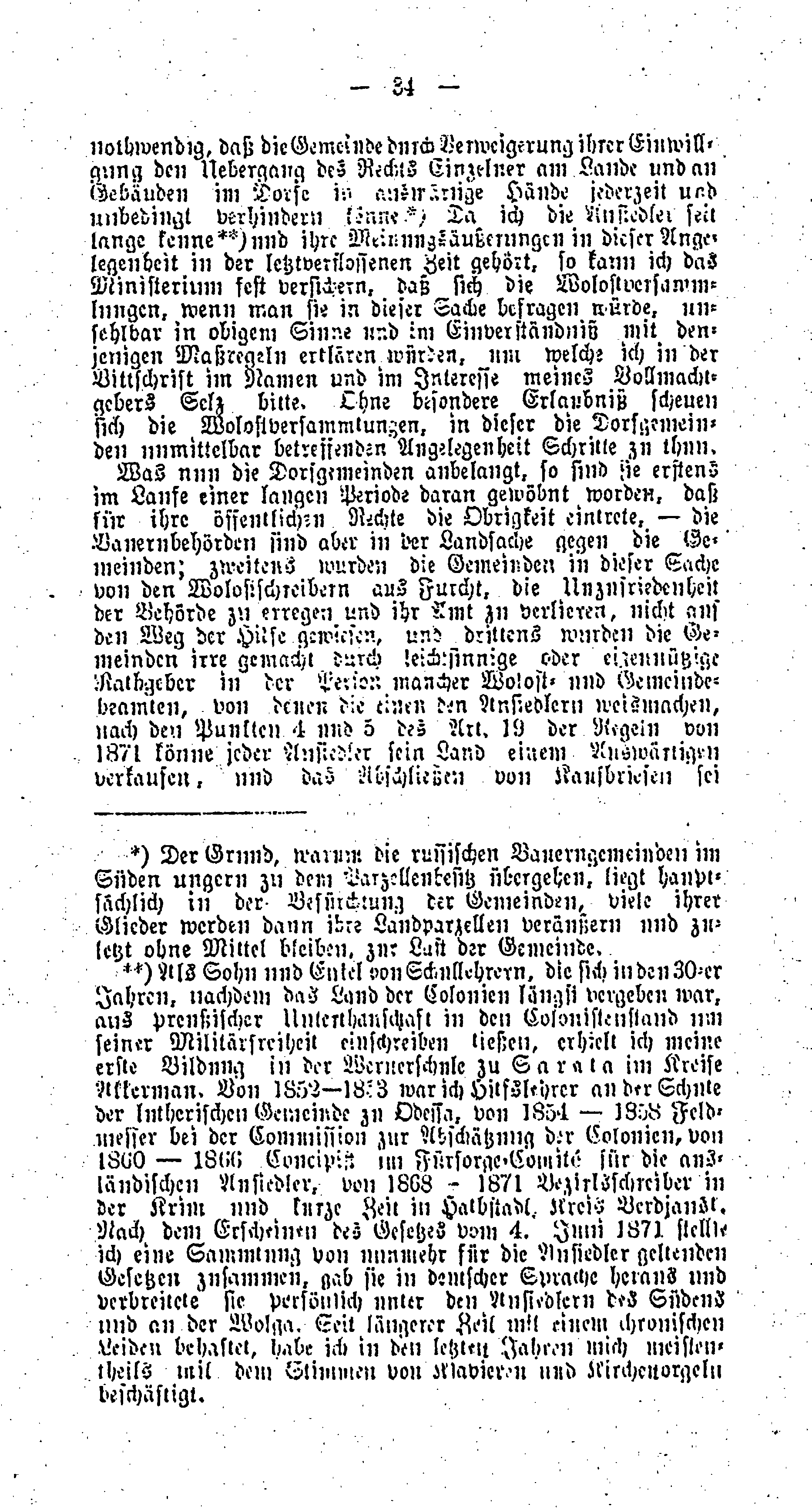 - ↑ Als Sohn und Enkel von Schullehrern, die sich in den 30-er Jahren, nachdem das Land der Colonien längst vergeben war, aus preußischer Unterthanschaft in den Colonistenstand um seiner Militärfreiheit einschreiben ließen, erhielt ich meine erste Bildung in der Wernerschule zu Sarata im Kreise Akkerman. Von 1852-1853 war ich Hilfslehrer an der Schule der lutherischen Gemeinde zu Odessa, von 1854-1858 Feldmesser bei der Comission zur Abschätzung der Colonien, von 1860-1866 Concipist im Fürsorge-Comité für die ausländischen Ansiedler, von 1868-1871 Bezirksschreiber in der Krim und kurze Zeit in Halbstadt, Kreis Berdjansk. Nach dem Erscheinen des Gesetzes vom 4. Juni 1871 stellte ich eine Sammlung von nunmehr für die Ansiedler geltenden Gesetzen zusammen, gab sie in deutscher Sprache heraus und verbreitete sie persönlich unter den Ansiedlern des Südens und an der Wolga. Seit längerer Zeit mit einem chronischen Leiden behaftet, habe ich in den letzten Jahren mich meistentheils mit dem Stimmen von Klavieren und Kirchenorgeln beschäftigt.