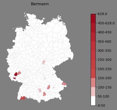 Relative Verteilung des Namens Bermann (1996)Direkt zur Karte Die Farbskala zeigt die Anzahl von "Bermann" bezogen auf je 1 Million Einträge. |