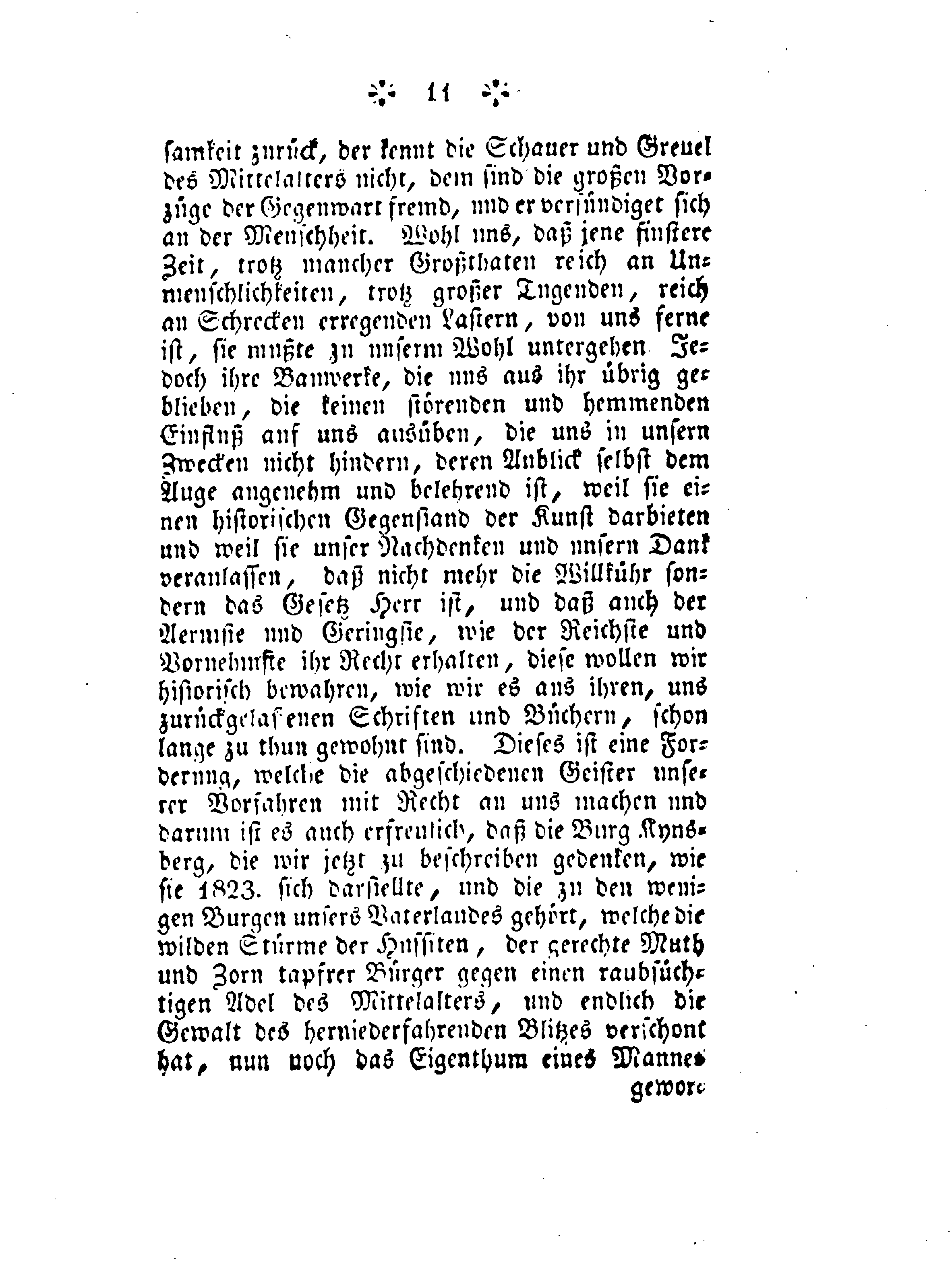 zurǘck, der kennt die Schauer und Greuel des Mittelalters nicht, dem sind die großen Vorzüge der Gegenwart fremd, und er versündigt sich an der Menschheit. Wohl uns, daß jene finsteren Zeit, trotz mancher Großthaten reich an Unmenschlichkeiten, trotz großer Tugenden, reich an Schrecken erregenden Lastern, von uns ferne ist, sie mußte zu unserm Wohl untergehen. Jedoch ihre Bauwerke, die uns aus ihr übrig geblieben, die keinen störenden und hemmenden Einfluß auf uns ausüben, die uns in unsern Zwecken nicht hindern, deren Anblick selbst dem Auge angenehm und belehrend ist, weil sie einen historischen Gegenstand der Kunst darbieten und weil sie unser Nachdenken und unsern Dank veranlassen, daß nicht mehr die Willkühr sondern das Gesetz Herr ist, und daß auch der Aermste und Geringste, wie der Reichste und Vornehmste ihr Recht erhalten, diese wollen wir historisch bewahren, wie wir es aus ihren, uns zurückgelassenen Schriften und Büchern, schon lange zu thun gewohnt sind. Dieses ist eine Forderung, welche die abgeschiedenen Geister unserer Vorfahren mit Recht an uns machen und darum ist es auch erfreulich, daß die Burg Kynsberg, die wir jetzt zu beschreiben gedenken, wie sie 1823 sich darstellte, und die zu den wenigen Burgen unsers Vaterlandes gehört, welche die wilden Stürme der Hussiten, der gerechte Muth und Zorn tapfer Bürger gegen einen raubsüchtigen Adel des Mittelalters, und endlich die Gewalt des herniederfahrenden Blitzes verschont hat, nun noch das Eigenthum eines Mannes