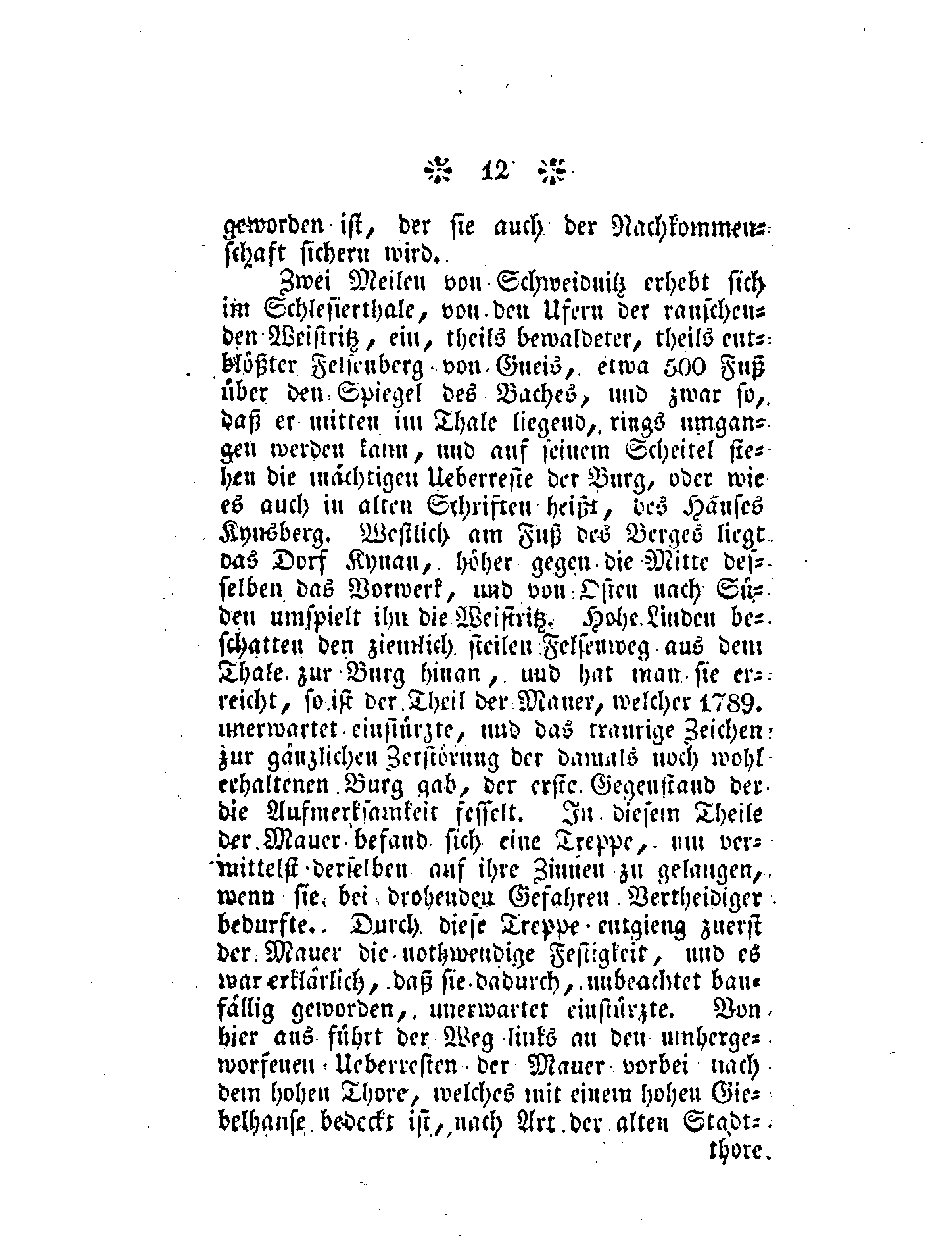 Zwei Meilen von Schweidnitz erhebt sich im Schlesierthale, von den Ufern der rauschenden Weistritz, ein, theils bewaldeter, theils entblößster Felsenberg von Gneis, etwa 500 Fuß über den Spiegel des Baches, und zwar so, daß er mitten im Thale liegend, rings umgangen werden kann, und auf seinem Scheitel stehen die mächtigen Ueberreste der Burg, oder wie es auch in alten Schriften heißt, das Hauses Kynsberg. Westlich am Fuße des Berges liegt das Dorf Kynau, höher gegen die Mitte desselben das Vorwerk, und von Osten nach Süden umspielt ihn die Weistritz. Hohe Linden beschatten den ziemlich steilen Felsenweg aus dem Thale zur Burg hinan, und hat man sie erreicht, so ist der Theil der Mauer, welcher 1789 unerwartet einstürzte, und das traurige Zeichen zur gänzlichen Zerstörung der damals doch wohl erhaltenen Burg gab, der erste Gegenstand, der die Aufmerksamkeit fesselt. In diesem Theile der Mauer befand sich eine Treppe, um vermittelst derselben auf ihre Zinnen zu gelangen, wenn sie bei drohenden Gefahren Vertheidiger bedurfte. Durch diese Treppe entgieng zuerst der Mauer die nothwendige Festigkeit, und es war erklärlich, daß sie dadurch, unbeachtet baufällig geworden, unerwartet einstürzte. Von hier aus führt der Weg links an den umhergeworfenen Ueberresten der Mauer vorbei nach dem hohen Thore, welches mit einem hohen Giebelhause bedeckt ist, nach Art der alten Stadtthore