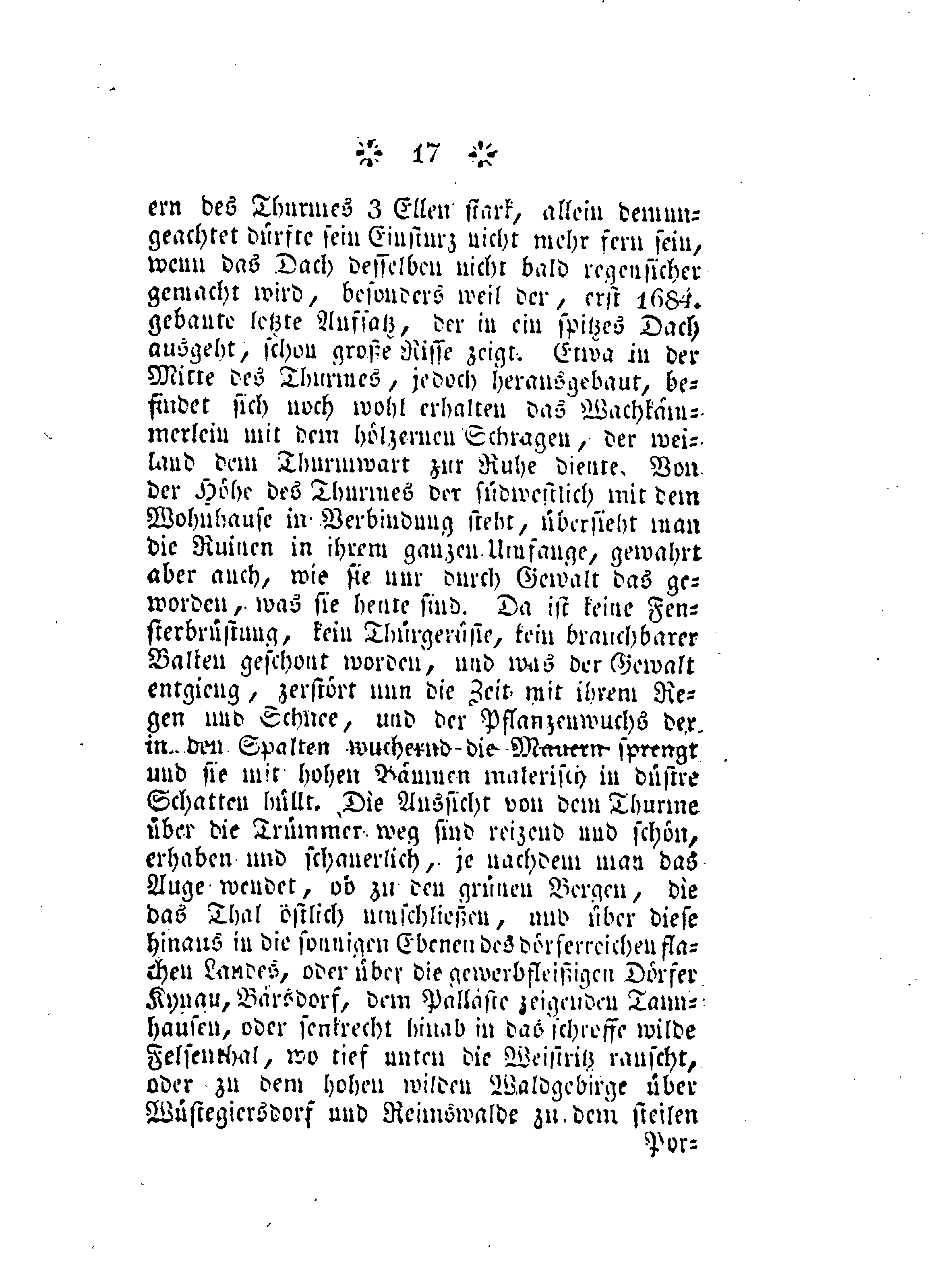 des Thurmes 3 Ellen stark, allein demungeachtet dürfte sein Einsturz nicht mehr fern sein, wenn das Dach desselben nicht bald regensicher gemacht wird, besonders weil der, erst 1684 gebaute letzte Aufsatz, der in ein spitzes Dach ausgeht, schon große Risse zeigt. Etwa in der Mitte des Thurmes, jedoch herausgebaut, befindet sich noch wohl erhalten das Wachkämmerlein mit dem hölzernen Schragen, der weiland dem Thurmwart zur Ruhe diente. Von der Höhe des Thurmes der südwestlich mit dem Wohnhause in Verbindung steht, übersieht man die Ruinen in ihrem ganzen Umfange, gewahrt aber auch, sie sie nur durch Gewalt das geworden sind, was sie heute sind. Da ist keine Fensterbrüstung, kein Thürgerüste, kein brauchbarer Balken geschont worden, und was der Gewalt entgieng, zerstört nun die Zeit mit ihrem Regen und Schnee, und der Pflanzenwuchs der in den Spalten wuchernd die Mauern sprengt und sie mit hohen Bäumen malerisch in düstre Schatten hüllt. Die Aussicht von dem Thurme über die Trümmer weg sind reizend und schön, erhaben und schauerlich, je nachdem man das Auge wendet, ob zu den grünen Bergen, die das Thal östlich umschließen, und über diese hinaus in die sonnigen Ebenen des dörferreichen flachen Landes, oder über die gewerbefleißigen Dörfer Kynau, Bärsdorf, dem Palläste zeigenden Tannhausen, oder senkrecht hinab in das schroffe wilde Felsenthal, wo tief unten die Weistritz rauscht, oder zu dem hohen wilden Waldgebirge über Wüstegiersdorf und Reimswalde zu dem steilen