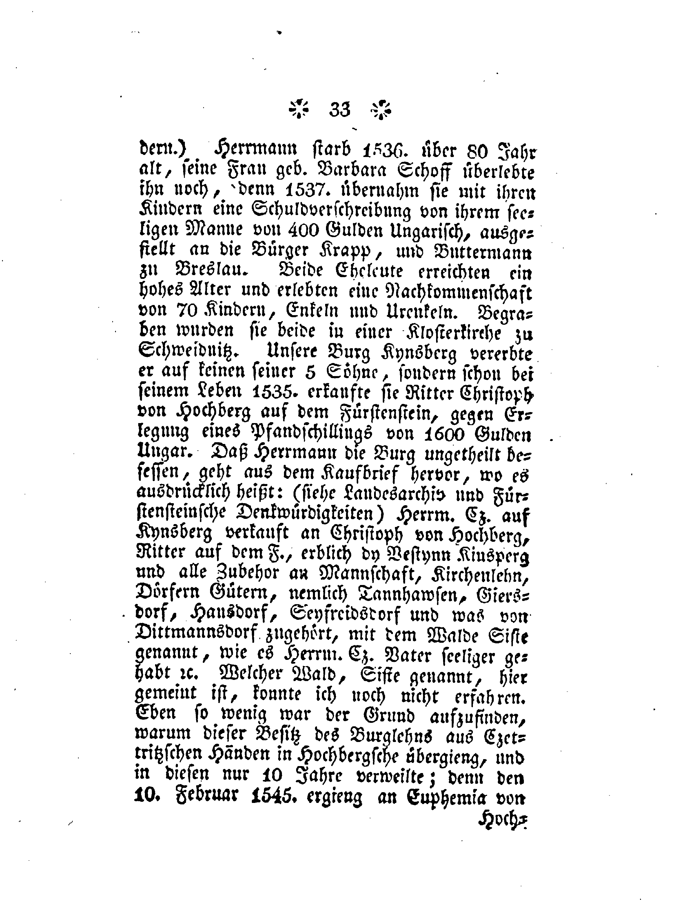 Herrmann starb 1536 über 80 Jahr alt, seine Frau geb. Barbara Schoff überlebte ihn noch, denn 1537 übernahm sie mit ihren Kindern eine Schuldverschreibung von ihrem seeligen Manne von 400 Gulden Ungarisch, ausgestellt an die Bürger Krapp, und Buttermann zu Breslau. Beide Eheleute errreichten ein hohes Alter und erlebten eine Nachkommenschaft von 70 Kindern, Enkeln und Urenkeln. Begraben wurden sie beide in einer Klosterkirche zu Schweidnitz. Unsere Burg Kynsberg vererbte er auf keinen seiner 5 Söhne, sondern schon bei seinem Leben 1535 erkaufte sie Ritter Christoph von Hochberg auf dem Fürstensteine, gegen Erlegung eines Pfandschillings von 1600 Gulden Ungar. Daß Herrmann die Burg ungetheilt besessen, geht aus dem Kaufbrief hervor, wo es ausdrücklich heißt: (s. Landesarchiv und Fürstensteinsche Denkwürdigkeiten) Herrm. Cz. auf Kynsberg verkauft an Christoph von Hochberg, Ritter auf dem F., erblich dy Vestynn Kinsperg und alle Zubehor an Mannschaft, Kirchenlehn, Dörfern, Gütern, nemlich Tannhawsen, Giersdorf, Hausdorf, Seyfreidsdorf und was von Dittmannsdorf zugehört, mit dem Walde Siste genannt, wie es Herrm. Cz. Vater seeliger gehabt ec. Welcher Wald, Siste genannt, hier gemeint ist, konnte ich noch nicht erfahren. Eben so wenig war der Grund aufzufinden, warum dieser Besitz des Burglehns aus Czettitzschen Händen in Hochbergsche übergieng, und in diesen nur 10 Jahre verweilte; denn den 10. Februar 1545 ergieng an Euphemia von Hochberg