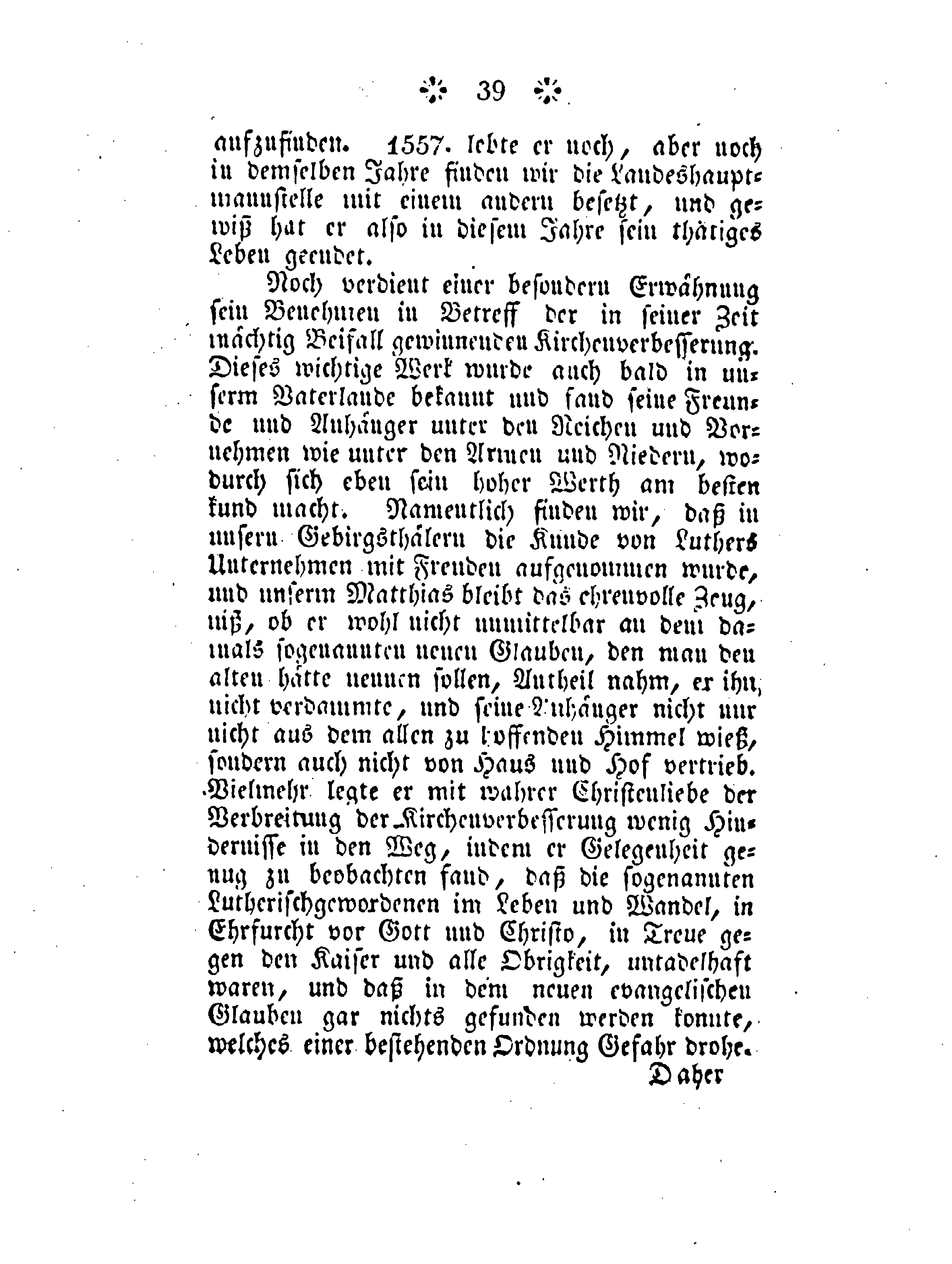 Noch verdient einer besondern Erwähnung sein Benehmen in Betreff der in seiner Zeit mächtig Beifall gewinnenden Kirchenverbesserung. Dieses wichtige Werk wurde auch bald in unserm Vaterlande und fand seine Freunde und Anhänger unter den Reichen und Vornehmen wie unter den Armen und Niedern, wodurch sich eben sein hoher Werth am besten kund macht. Namentlich finden wir, daß in unsern Gebirgsthälern die Kunde von Luthers Unternehmen mit Freude aufgenommen wurde, und unserm Matthias bleibt das ehrenvolle Zeugniß, ob er wohl nicht unmittelbar an dem damals sogenannten neuen Glauben, den man den alten hätte nennen sollen, Antheil nahm, er ihn nicht verdammte, und seine Anhänger nicht nur nicht aus dem allen zu hoffenden Himmel wieß, sondern auch nicht von Haus und Hof vertrieb. Vielmehr legte er mit wahrer Christenliebe der Verbreitung der Kirchenverbesserung wenig Hindernisse in den Weg, indem er Gelegenheit genug zu beobachten fand, daß die sogenannten Lutherischgewordenen im Leben und Wandel, in Ehrfurcht vor Gott und Christo, in Treue gegen den Kaiser und alle Obrigkeit, untadelhaft waren, und daß in dem neuen evangelischen Glauben gar nichts gefunden werden konnte, welches einer bestehenden Ordnung Gefahr drohe.
