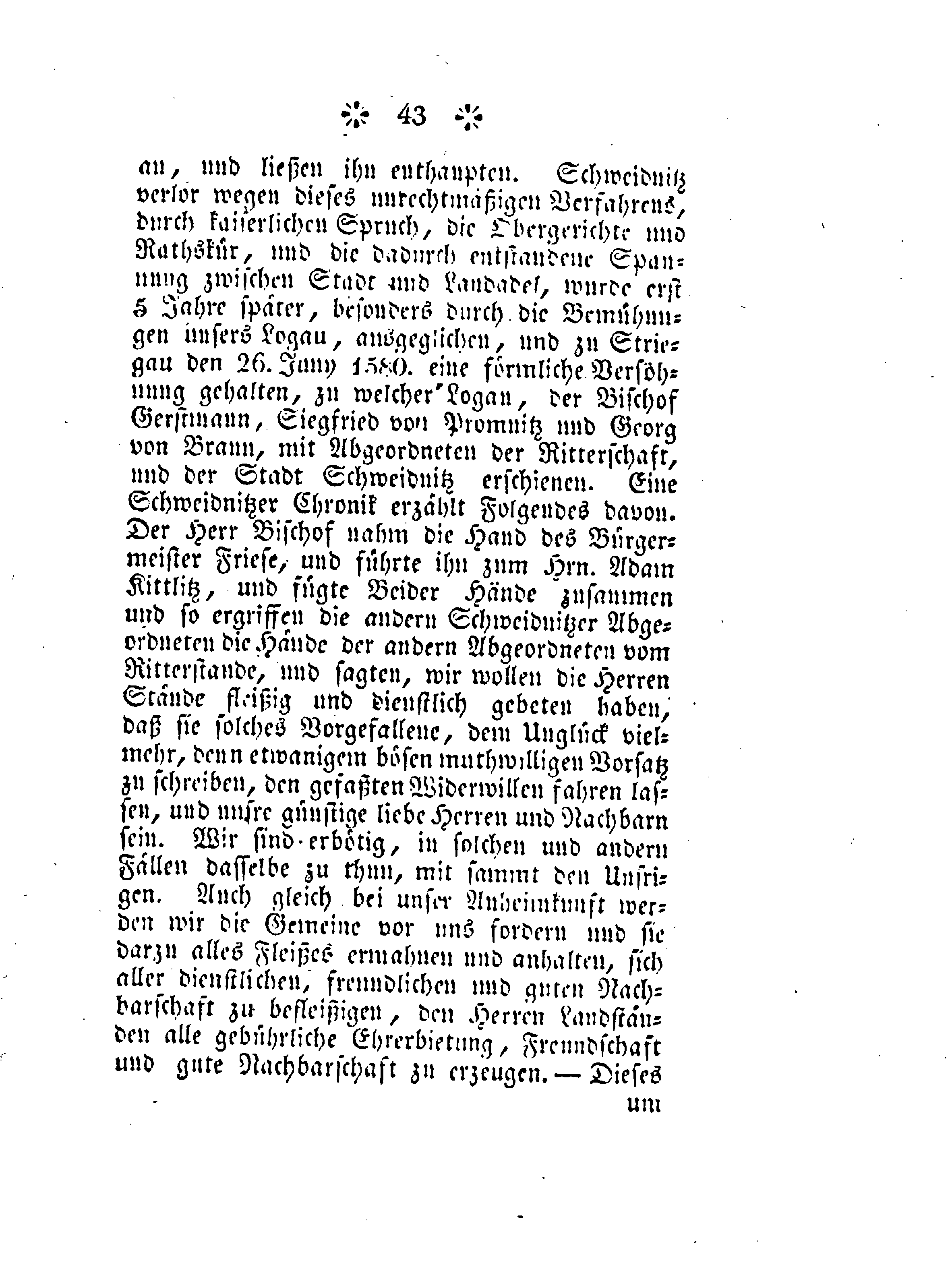 an, und ließen ihn enthaupten. Schweidnitz verlor wegen dieses unrechtmäßigen Verfahrens, durch kaiserlichen Spruch, die Obergerichte und Rathskür, und die dadurch entstandene Spannung zwischen Stadt und Landadel, wurde erst 5 Jahre später, besonders durch die Bemühungen unsers Logau, ausgeglichen, und zu Striegau den 26. Juny 1580 eine förmliche Versöhnung gehalten, zu welcher Logau, der Bischof Gerstmann, Siegfried von Promnitz und Georg von Braun, mit Abgeordneten der Ritterschaft, und der Stadt Schweidnitz erschienen. Eine Schweidnitzer Chronik erzählt folgendes davon. Der Herr Bischof nahm die Hand des Bürgermeister Friese, und führte ihn zum Hrn. Adam Kittlitz, und fügte beider Hände zusammen und so ergriffen die andern Schweidnitzer Abgeordneten die Hände der andern Abgeordneten vom Ritterstande, und sagten, wir wollen die Herren Stände fleißig und dienstlich gebeten haben, daß sie solches Vorgefallene, dem Unglück vielmehr, denn etwaigem bösen muthwilligen Vorsatz zu schreiben, den gefaßten Widerwillen fahren lassen, und unsre günstige liebe Herren und Nachbarn sein. Wir sind erbötig, in solchen und andern Fällen dasselbe zu thun, mit sammt den Unsrigen. Auch gleich bei unser Anheimkunst werden wir die Gemeine vor uns fordern und sie darzu alles Fleißes ermahnen und anhalten, sich aller dienstlichen, freundlichen und guten Nachbarschaft zu befleißigen, den Herren Landesständen alle gebührliche Ehrerbietung, Freundschaft und gute Nachbarschaft zu erzeugen. - Dieses