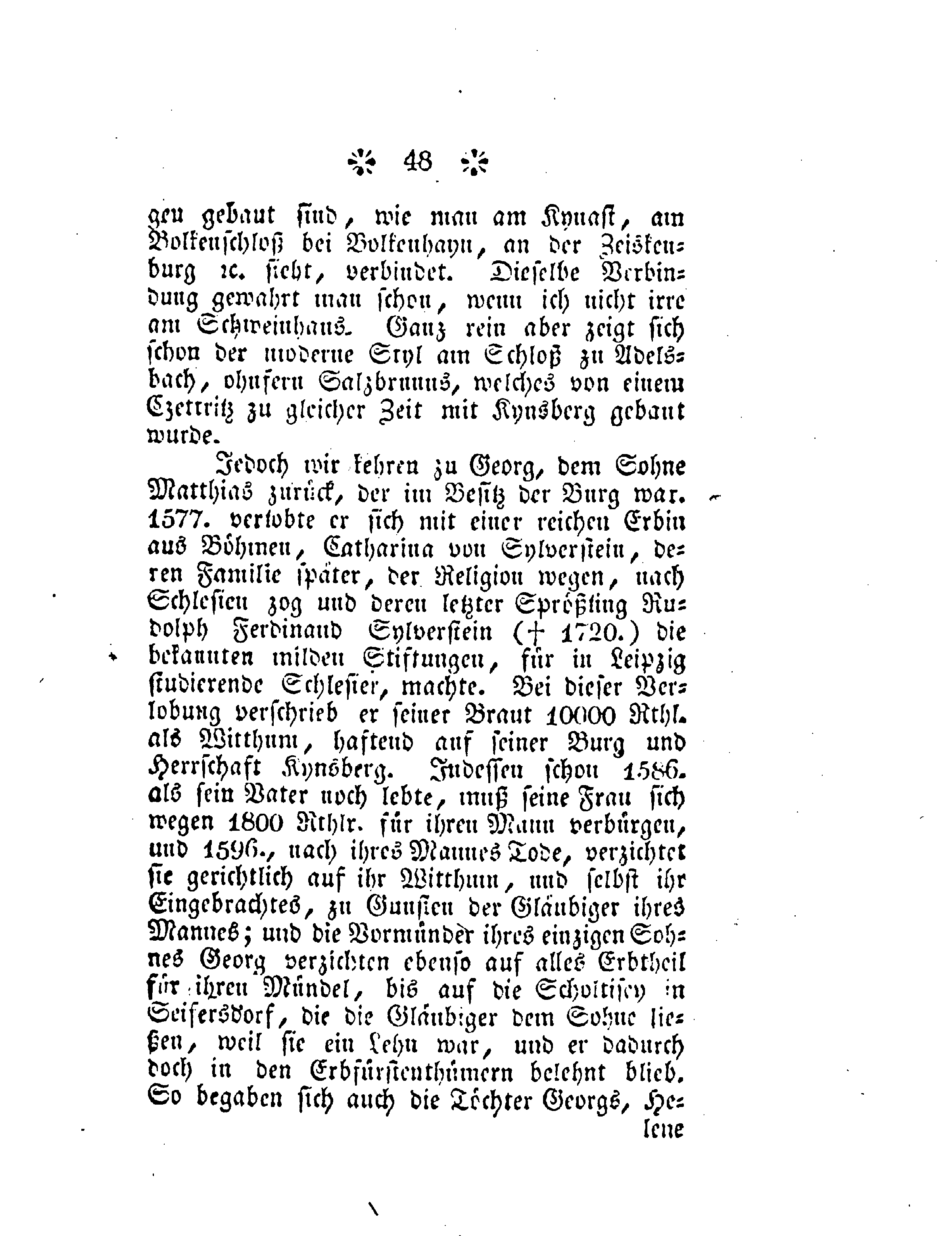 Jedoch kehren wir zu Georg, dem Sohne Matthias zurück, der im Besitz der Burg war. 1577 verlobte er sich mit einer reichen Erbin aus Böhmen, Catharina von Sylverstein, deren Familie später, der Religion wegen, nach Schlesien zog und deren letzter Sprößling Rudolph Ferdinand Sylverstein (+ 1720) die bekannten milden Stiftungen, für in Leipzig studierende Schlesier, machte. Bei dieser Verlobung verschrieb er seiner Braut 10000 Rthl. als Witthum, haftend auf seiner Burg und Herrschaft Kynsberg. Indessen schon 1586 als sein Vater noch lebte, muß seine Frau sich wegen 1800 Rthl. für ihren Mann verbürgen, und 1596 nach ihres Mannes Tode, verzichtet sie gerichtlich auf ihr Witthum, und selbst ihr Eingebrachtes, zu Gunsten der Gläubiger ihres Mannes; und die Vormünder ihres einzigen Sohnes Georg verzichten ebenso auf alles Erbtheil für ihr Mündel, bis auf die Scholtisey in Seifersdorf, die die Gläubiger dem Sohne ließen, weil sie ein Lehn war, und er dadurch doch in den Erbfürstenthümern belehnt blieb. So begaben sich die Töchter Georgs, He-