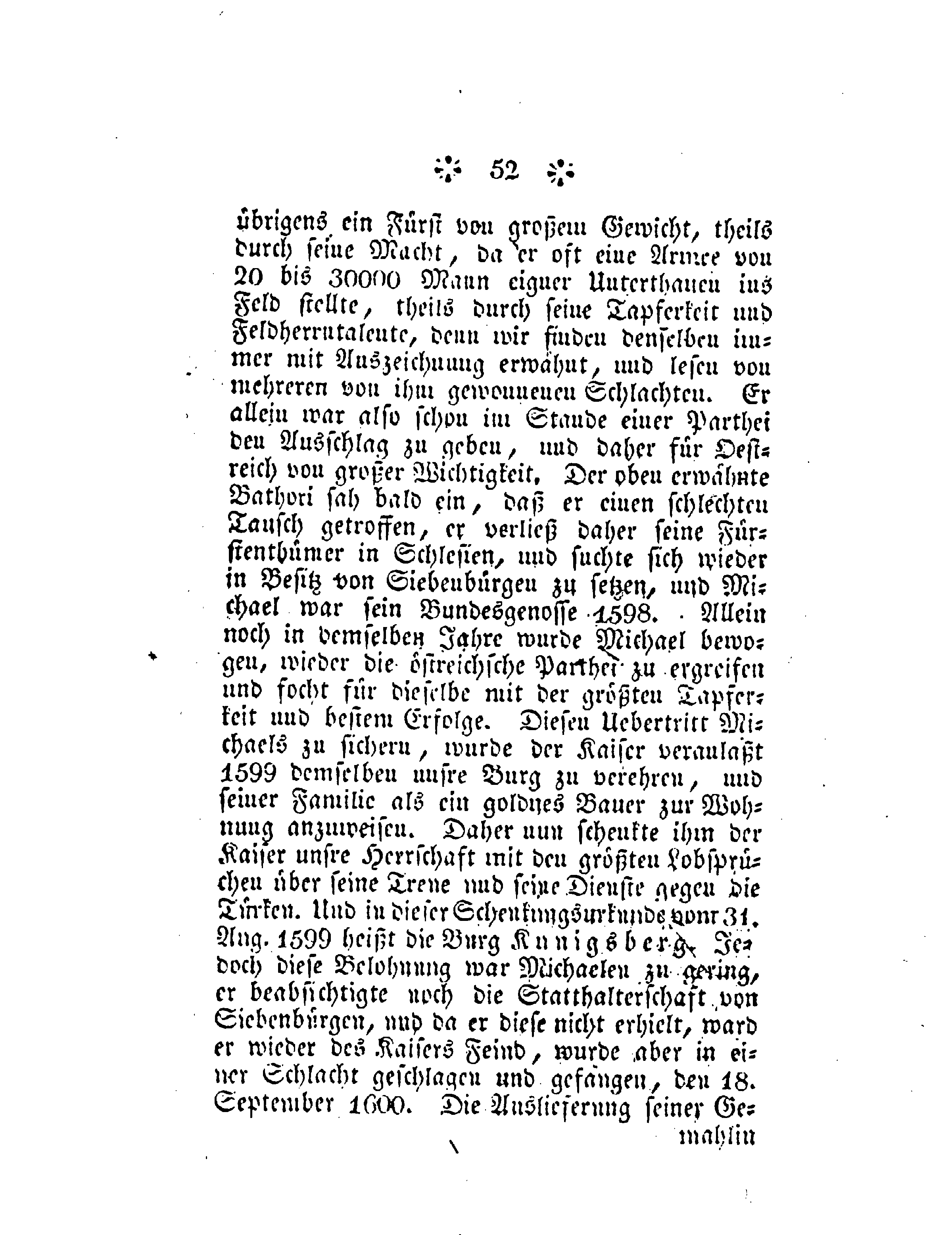 übriegens ein Fürst von großem Gewicht, Theils durch seine Macht, da er oft eine Armee von 20 bis 30000 Mann eigner Unterthanen ins Feld stellte, theils durch seine Tapferkeit und Feldherrntalente, denn wir finden denselben immer mit Auszeichnung erwähnt, und lesen von mehreren von ihm gewonnenen Schlachten. Er war also schon im Stande einer Parthei den Ausschlag zu geben, und daher von Oestreich von großer Wichtigkeit. Der oben erwähnte Bathori sah bald ein, daß er einen schlechten Tausch getroffen, er verließ daher seine Fürstenthümer in Schlesien, und suchte sich wieder in Besitz von Siebenbürgen zu setzen, und Michael war sein Bundesgenosse 1598. Allein noch in demselben Jahre wurde Michael bewogen, wieder die östreichsche Parthei zu ergreifen und focht für dieselbe mit der größten Tapferkeit und bestem Erfolg. Diesen Uebertritt Michaels zu sichern, wurde der Kaiser veranlaßt 1599 demselben unsre Burg zu verehren, und seiner Familie als ein goldnes Bauer zur Wohnung anzuweisen. Daher nun schenkte ihm der Kaiser unsre Herrschaft mit den größten Lobsprüchen über seine Treue und seine Dienste gegen die Türken. Und in dieser Schenkungsurkunde vom 31. Aug. 1599 heißt die Burg Kunisberg. Jedoch diese Belohnung war Michaelen zu gering, er beabsichtigte noch die Statthalterschaft von Siebenbürgen, und da er diese nicht erhielt, ward er wieder des Kaisers Feind, wurde aber in einer Schlacht geschlagen und gefangen, den 18. September 1600. Die Auslieferung seiner Ge-
