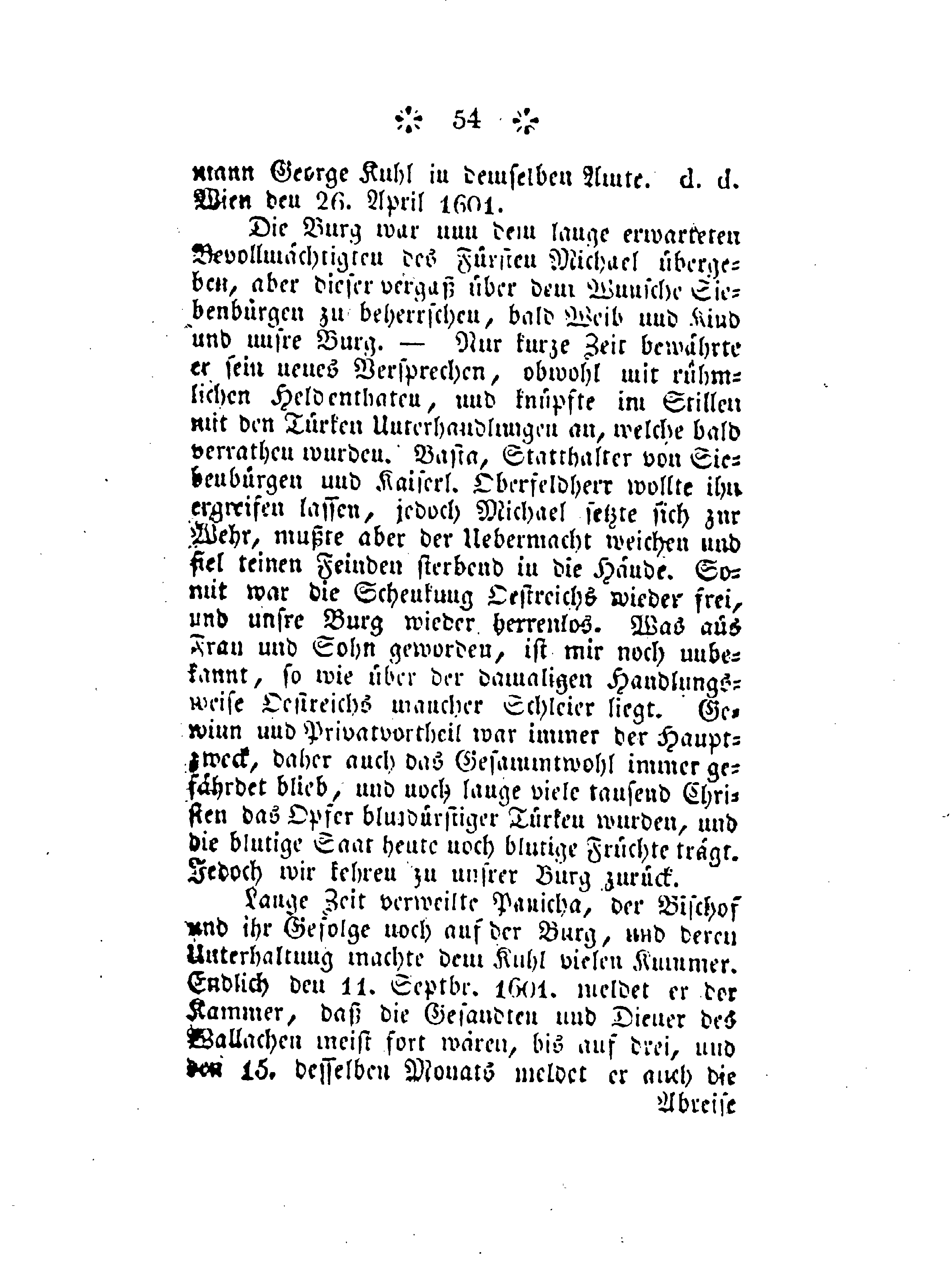 mann George Kuhl in demselben Amte. d. d. Wien den 26. April 1601. Die Burg war nun dem lange erwarteten Bevollmächtigten des Fürsten Michael übergeben, aber dieser vergaß über dem Wunsche Siebenbürgen zu beherrschen, bald Weib und Kind und unsre Burg. - Nur kurze Zeit bewährte er sein neues Versprechen, obwohl mit rühmlichen Heldenthaten, und knüpfte im Stillen mit den Türken Unterhandlungen an, welche bald verrathen wurden. Basta, Statthalter von Siebenbürgen und Kaiserl. Oberfeldherr wollte ihn ergreifen lassen, jedoch Michael setzte sich zur Wehr, mußte aber der Uebermacht weichen und fiel seinen Feinden sterbend in die Hände. Somit war die Schenkung Oestreichs wieder frei, und unsre Burg wieder herrenlos. Was aus Frau und Sohn geworden , ist mir noch unbekannt, so wie über der damaligen Handlungsweise Oestreichs mancher Schleier liegt. Gewinn und Privatvortheil war immer der Hauptzweck, daher auch das Gesammtwohl immer gefährdet blieb, und noch lange viele tausend Christen das Opfer blutrünstiger Türken wurden, und die blutige Saat heute noch blutige Früchte trägt. Jedoch wir kehren zu unsrer Burg zurück.