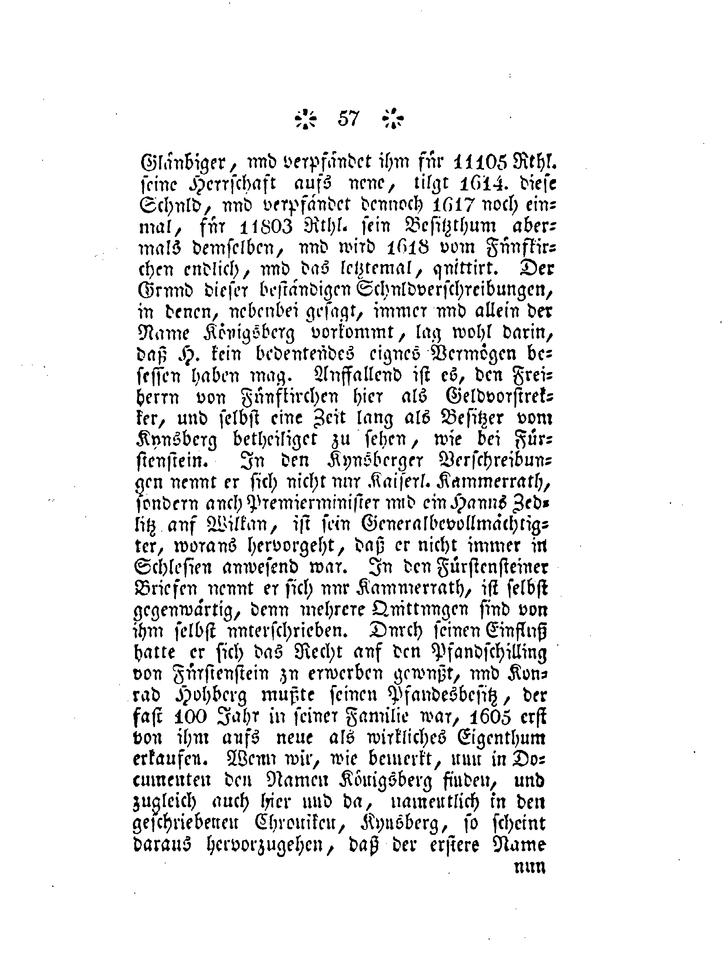 Gläubiger, und verpfändet ihm für 11105 Rthl. seine Herrschaft aus neue, tilgt 1614 diese Schuld, und verpfändet dennoch 1617 noch einmal, für 11803 Rthl. sein Besitzthum abermals demselben, und wird 1618 vom Fünfkirchen endlich, und das letztemal, quittirt. Der Grund dieser beständigen Schuldverschreibungen, in denen, nebenbei gesagt, immer und allein der name Königsberg vorkommt, lag wohl darin, daß H. kein bedeutendes eignes Vermögen besessen haben mag. Auffallend ist es, den Freiherrn von Fünfkirchen hier als Geldvorstrecker, und selbst eine Zeit lang als Besitzer vom Kynsberg betheiliget zu sehen, wie bei Fürstenstein. In den Kynsberger Verschreibungen nennt er sich nicht nur Kaiserl. Kammerrath, sondern auch Premierminister und ein Hanns Zedlitz auf Wilkau, ist sein Generalbevollmächtigter, woraus hervorgeht, daß er nicht immer in Schlesien anwesend war. In den Fürstensteiner Briefen nennt er sich nur Kammerrath, ist selbst gegenwärtig, denn mehrere Quittungen sind von ihm selbst unterschrieben. Durch seinen Einfluß hatte er sich das Recht auf den Pfandschilling von Fürstenstein zu erwerben gewußt, und Konrad Hohberg mußte seinen Pfandbesitz, der fast 100 Jahr in seiner Familie war, 1605 erst von ihm aufs neue als wirkliches Eigenthum erkaufen. Wenn wir, wie bemerkt, nun in Documenten den Namen Königsberg finden, und zugleich auch hier und da, namentlich in den geschriebenen Chroniken, Kynsberg, so scheint daraus hervorzugehen, daß der erstere Name