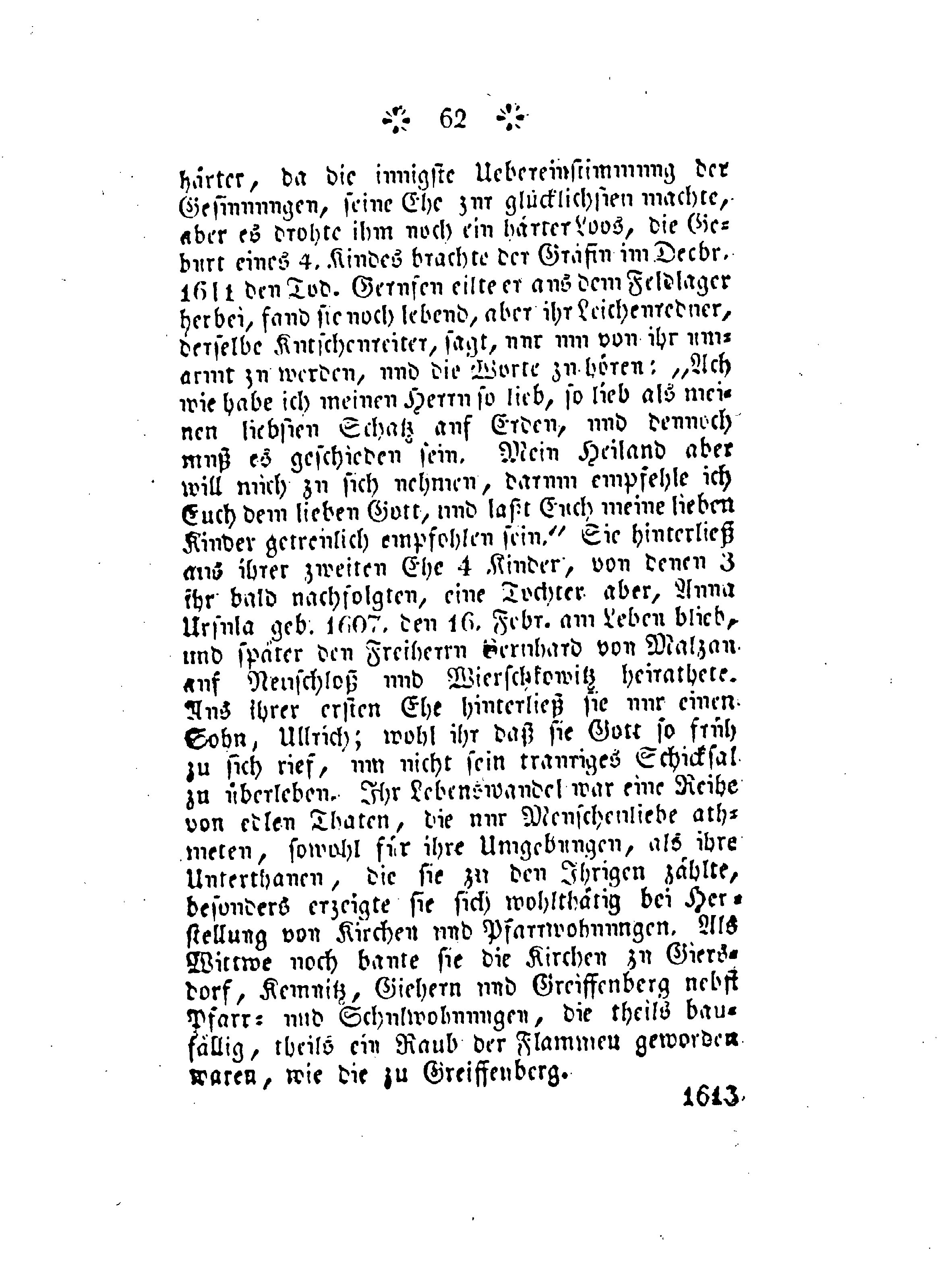 härter, da die innigste Uebereinstimmung der Gesinnungen, seine Ehe zur glücklichsten machte, aber es drohte ihm noch ein härteres Loos, die Geburt eines 4. Kindes brachte der Gräfin im Decbr. 1611 den Tod. Gerufen eilte er aus dem Feldlager herbei, fand sie noch lebend, aber ihr Leichenredner, derselbe Kutschreiter, sagt, nur um ihr umarmt zu werden, und die Worte zu hören: “Ach, wie habe ich meinen Herrn so lieb, so lieb als meinen liebsten Schatz auf Erden, und dennoch muß es geschieden sein. Mein Heiland aber will mich zu sich nehmen, darum empfehle ich Euch dem lieben Gott, und laßt Euch meine lieben Kinder getreulich empfohlen sein.”'Sie hinterließ aus ihrer zweiten Ehe 4 Kinder, von denen 3 ihr bald nachfolgten, eine Tochter aber, Anna Ursula geb. 1607 den 16. Febr. am Leben blieb, und später den Freiherrn Bernhard von Malzan auf Neuschloß und Wierschkowitz heirathete. Aus ihrer ersten Ehe hinterließ sie nur einen Sohn, Ullrich; wohl ihr daß sie Gott so früh zu sich rief, um nicht sein trauriges Schicksal zu überleben. Ihr Lebenswandel war eine Reihe von edlen Thaten, die nur Menschenliebe athmeten, sowohl für ihre Umgebungen, als ihre Unterthanen, die sie zu den ihrigen zählte, besonders erzeigte sie sich wohlthätig bei Herstellung von Kirchen und Pfarrwohnungen. Als Wittwe noch baute sie die Kirchen zu Giersdorf, Kemnitz, Giehern und Greiffenberg nebst Pfarr- und Schulwohnungen, die theils baufällig, theils ein Raub der Flammen geworden waren, wie die zu Greiffenberg.