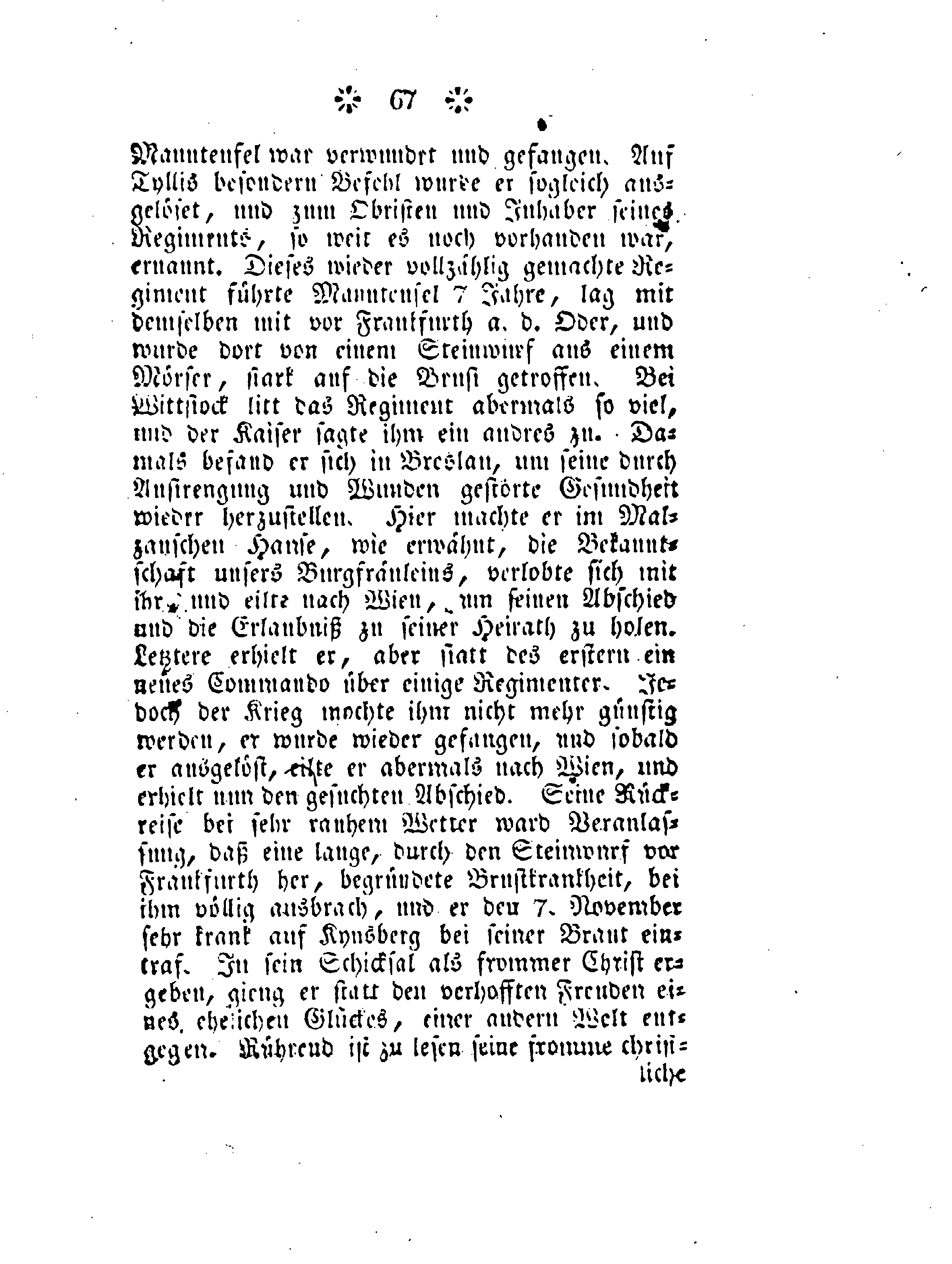 Mannteufel war verwundet und gefangen. Auf Tyllis besondern Befehl wurde er sogleich ausgelöset, und zum Obristen und Inhaber seines Regiments, so weit es noch vorhanden war, ernannt. Dieses wieder vollzählig gemachte Regiment führte Mannteufel 7 Jahre, lag mit demselben mit vor Frankfurth a. d. Oder, und wurde dort von einem Steinwurf aus einem Mörser, stark auf die Brust getroffen. Bei Wittstock litt das Regiment abermals so viel, und der Kaiser sagte ihm ein andres zu. Damals befand er sich in Breslau, um seine durch Anstrengung und Wunden gestörte Gesundheit wieder herzustellen. Hier machte er im Malzanschen Hause, wie erwähnt, die Bekanntschaft unsers Burgfräuleins, verlobte sich mit ihr, und eilte nach Wien, um seinen Abschied und die Erlaubniß zu seiner Heirath zu holen. Letztere erhielt er, aber statt des erstern ein neues Commando über einige Regimenter. Jedoch der Krieg mochte ihm nicht mehr günstig werden, er wurde wieder gefangen, und sobald er ausgelöst, eilte er abermals nach Wien, und erhielt nun den gesuchten Abschied. Seine Rückreise bei sehr rauhem Wetter ward Veranlassung, daß eine lange, durch den Steinwurf von Frankfurth her, begründete Brustkrankheit, bei ihm völlig ausbrach, und er den 7. November sehr krank auf Kynsberg bei seiner Braut eintraf. In sein Schicksal als frommer Christ ergeben, gieng er statt den verhofften Freuden eines ehelichen Glückes, einer andern Welt entgegen. Rührend ist zu lesen seine fromme christ-