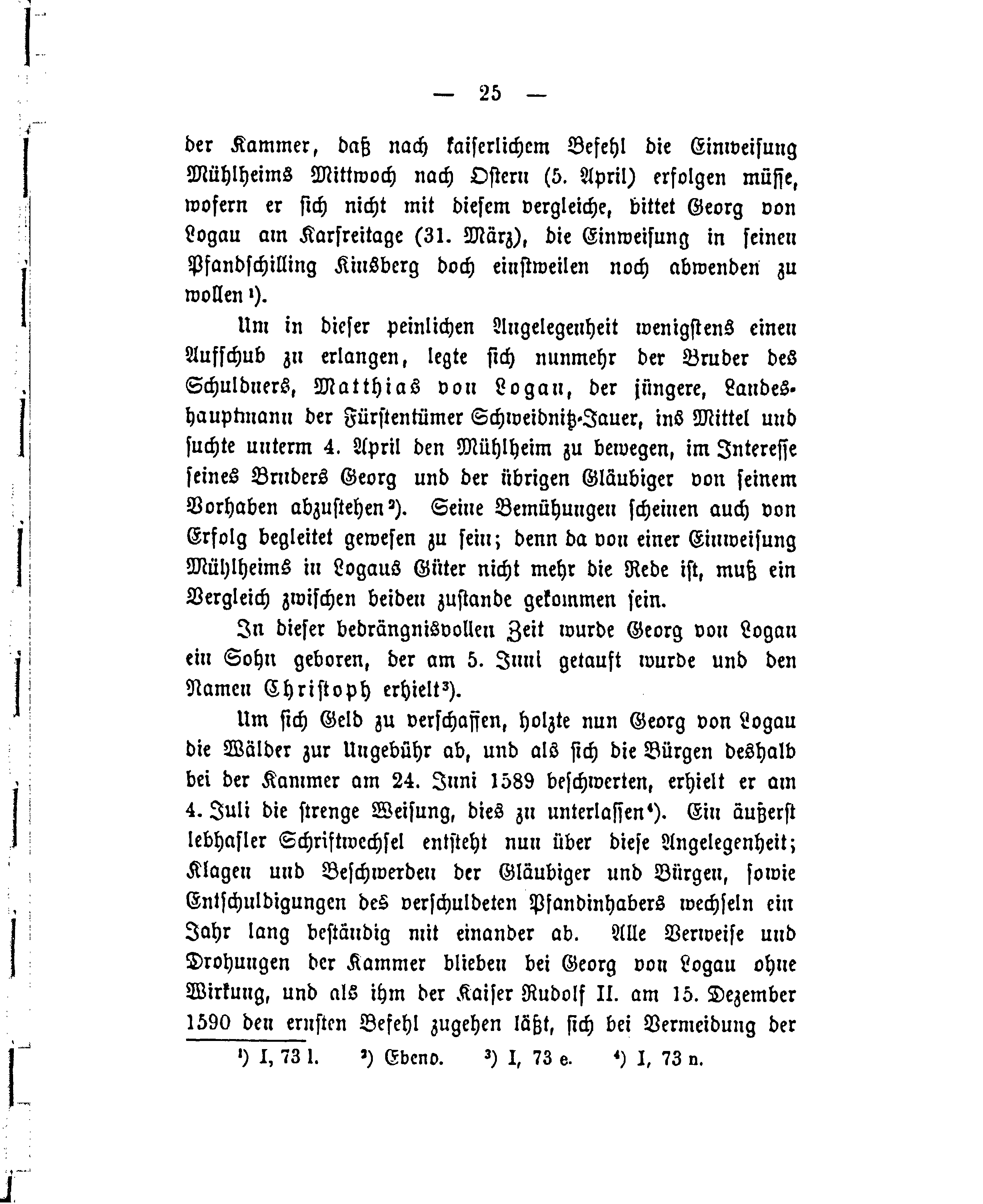 Um sich Geld zu verschaffen, holzte nun Georg von Logau die Wälder zur Ungebühr ab, und als sich die Bürgen deshalb bei der Kammer am 24. Juni 1589 beschwerten, erhielt er am 4. Juli die strenge Weisung, dies zu unterlassen[4]. Ein äußerst lebhafter Schriftwechsel entsteht nun über diese Angelegenheit; Klagen und Beschwerden der Gläubiger und Bürgen, sowie Entschuldigungen des verschuldeten Pfandinhabers wechseln ein Jahr lang beständig mit einander ab. Alle Verweise und Drohungen der Kammer blieben bei Georg von Logau ohne Wirkung, und als ihm der Kaiser Rudolf II. am 15. Dezember 1590 den ernsten Befehl zugehen läßt, sich bei Vermeidung der
