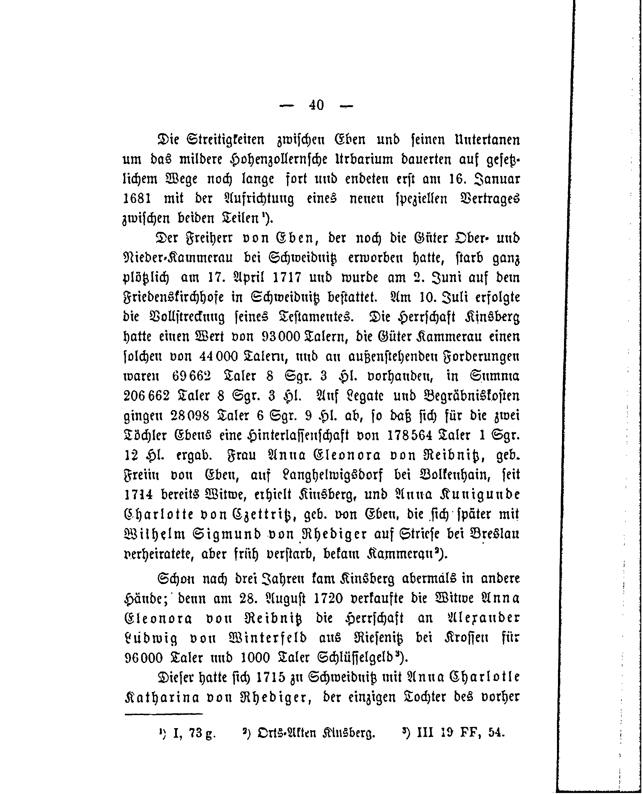 Der Freiherr von Eben, der noch die Güter Ober- und Nieder-Kammerau bei Schweidnitz erworben hatte, starb ganz plötzlich am 17. April 1717 und wurde am 2. Juni auf dem Friedenskirchhofe in Schweidnitz bestattet. Am 10. Juli erfolgte die Vollstreckung seines Testamentes. Die Herrschaft Kinsberg hatte einen Wert von 93000 Talern, die Güter Kammerau einen solchen von 44 000 Talern, und an außenstehenden Forderungen waren 69 662 Taler 8 Sgr. 3 Hl. vorhanden, in Summa 206 662 Taler 8 Sgr. 3 Hl. Auf Legate und Begräbniskosten gingen 28098 Taler 6 Sgr. 9 Hl. ab, so daß sich für die zwei Töchter Ebens eine Hinterlassenschaft von 178564 Taler 1,Sgr. 12 Hl. ergab. Frau Anna Eleonora von Reibnitz, geb. Freiin von Eben, auf Langhelwigsdorf bei Bolkenhain, seit 1714 bereits Witwe, hielt Kinsberg, und Anna Kunigunde Charlotte von Czettritz, geb. von Eben, die sich später mit Wilhelm Sigmund von Rhediger auf Striese bei Breslau verheiratete, aber früh verstarb, bekam Kammerau[2].