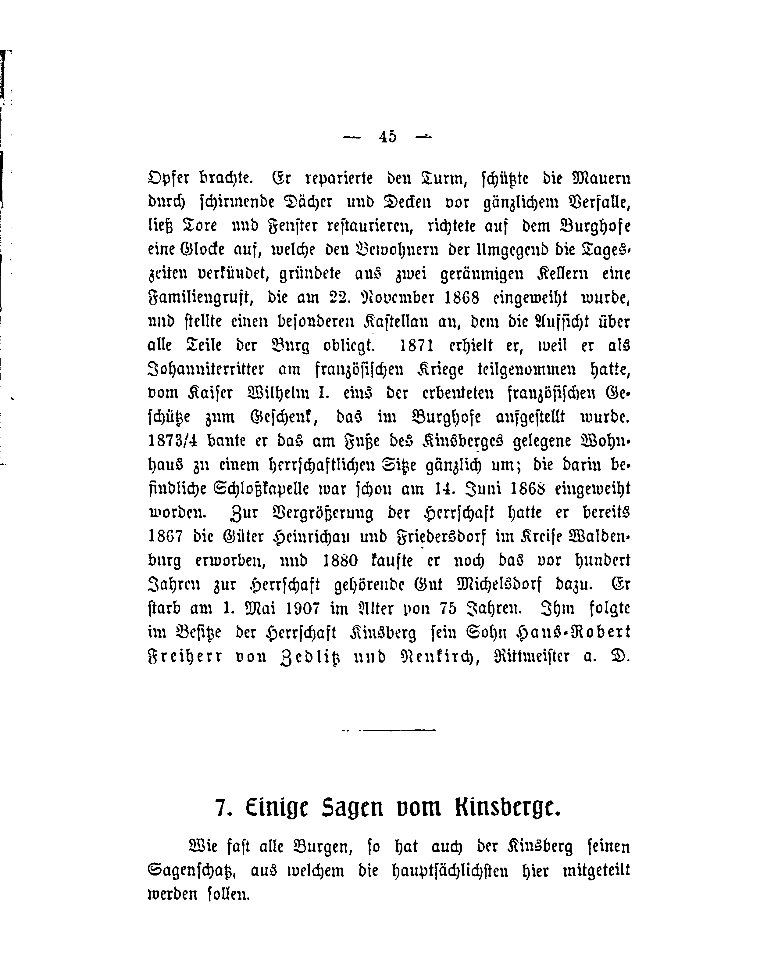Opfer brachte. Er reparierte den Turm, schützte die Mauern durch schirmende Dächer und Decken vor gänzlichem Verfalle, ließ Tore und Fenster restaurieren, richtete auf dem Burghofe eine Glocke auf, welche den Bewohnern der Umgegend die Tageszeiten verkündet, gründete aus zwei geräumigen Kellern eine Familiengruft, die am 22. November 1868 eingeweiht wurde, und stellte einen besonderen Kastellan an, dem die Aufsicht über alle Teile der Burg obliegt. 1871 erhielt er, weil er als Johanniterritter am französischen Kriege teilgenommen hatte, vom Kaiser Wilhelm I. eins der erbeuteten französischen Geschütze zum Geschenk, das im Burghofe aufgestellt wurde. 1873/4 baute er das am Fuße des Kinsberges gelegene Wohnhaus zu einem herrschaftlichen Sitze gänzlich um; die darin befindliche Schloßkapelle war schon am 14. Juni 1868 eingeweiht worden. Zur Vergrößerung der Herrschaft hatte er bereits 1367 die Güter Heinrichau und Friedersdorf im Kreise Waldenburg erworben, und 1880 kaufte er noch das vor hundert Jahren zur Herrschaft gehörende Gut Michelsdorf dazu. Er starb am 1. Mai 1907 im Alter von 75 Jahren. Ihm folgte im Besitze der Herrschaft Kinsberg sein Sohn Hans-Robert Freiherr von Zedlitz und Neukirch, Rittmeister a. D.