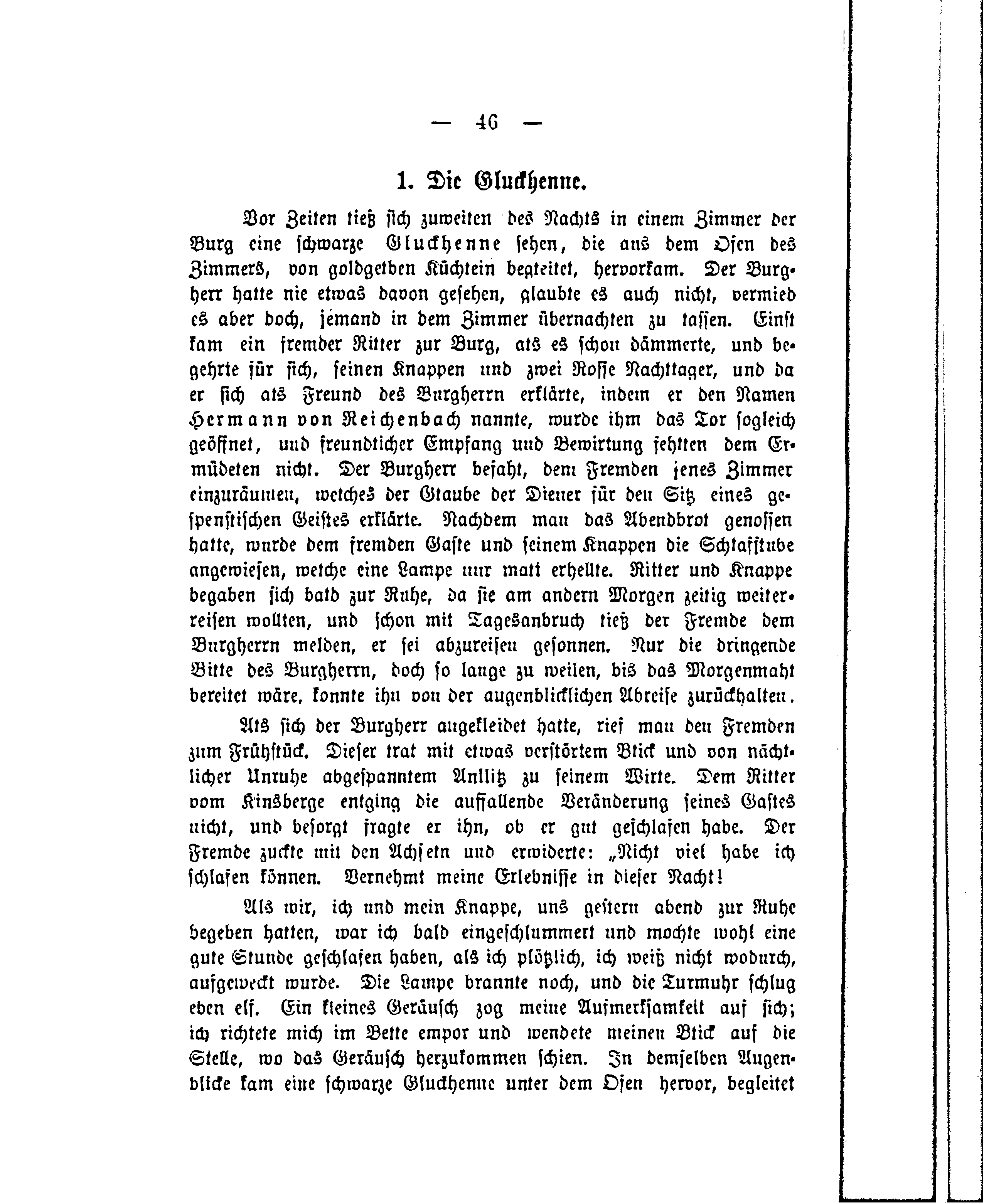 Als wir, ich und mein Knappe, uns gestern abend zur Ruhe begeben hatten, war ich bald eingeschlummert und mochte wohl eine gute Stunde geschlafen haben, als ich plötzlich, ich weiß nicht wodurch, aufgeweckt wurde. Die Lampe brannte noch, und die Turmuhr schlug eben elf. Ein kleines Geräusch zog meine Aufmerksamkeit auf sich; ich richtete mich im Bette empor und wendete meinen Blick auf die Stelle, wo das Geräusch herzukommen schien. In demselben Augenblicke kam eine schwarze Gluckhenne unter dem Ofen hervor, begleitet