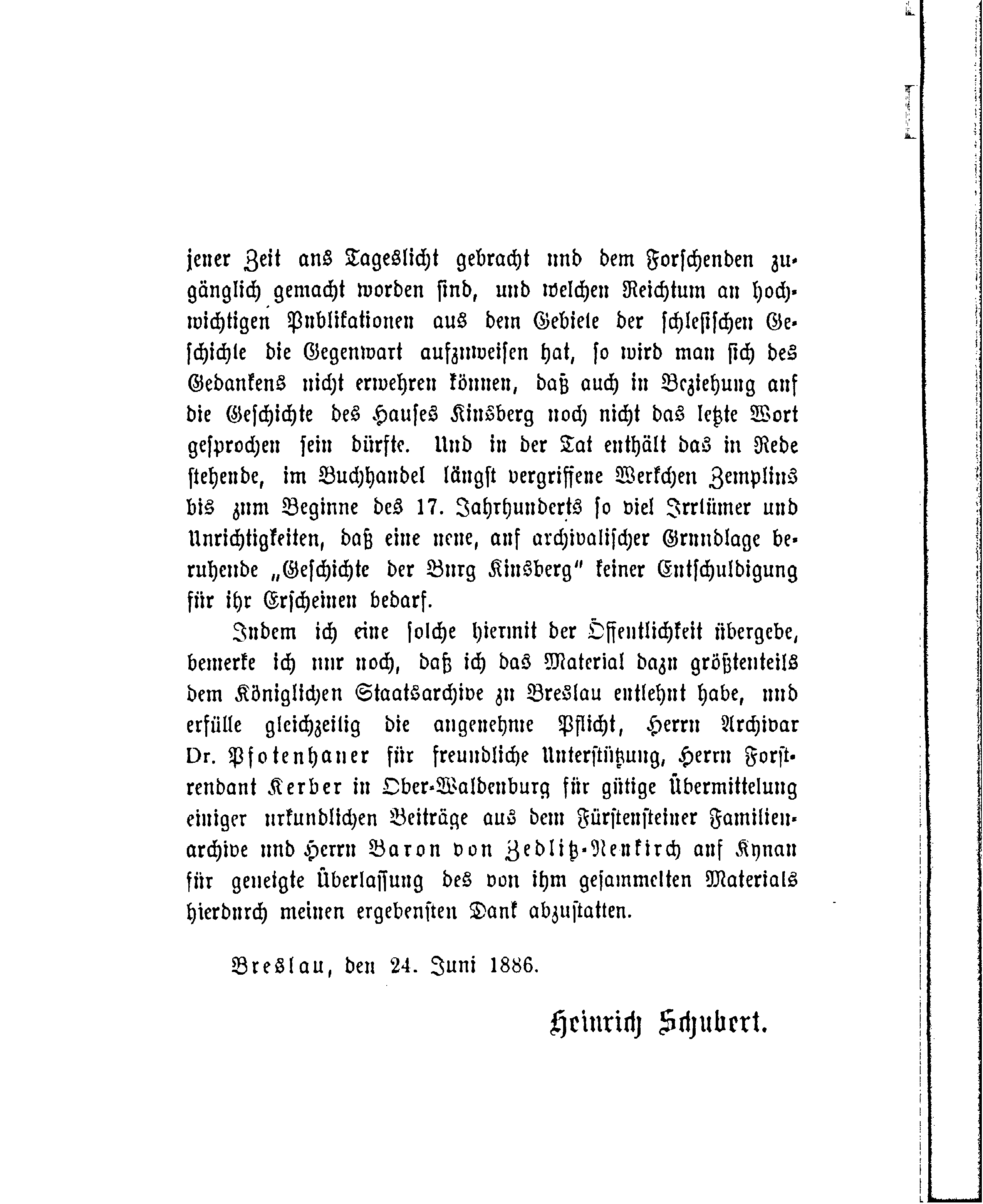 Indem ich eine solche hiermit der Öffentlichkeit übergebe, bemerke ich nur noch, daß ich das Material dazu größtenteils dem Königlichen Staatsarchive zu Breslau entlehnt habe, und erfülle gleichzeitig die angenehme Pflicht, Herrn Archivar Dr. Pfotenhauer für freundliche Unterstützung, Herrn Forstrendant Kerber in Ober-Waldenburg für gütige Übermittelung einiger urkundlichen Beiträge aus dem Fürstensteiner Familienarchive und Herrn Baron von Zedlitz-Neukirch auf Kynau für geneigte Überlassung des von ihm gesammelten Materials hierdurch meinen ergebensten Dank abzustatten.