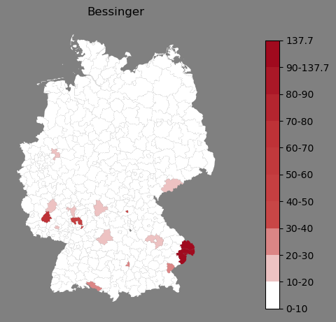 Absolute Verteilung des Namens Bessinger (1890)Direkt zur Karte Absolute Verteilung des Namens "Bessinger" um 1890 im damaligen Deutschen Reich Sie können die Karte innerhalb des Fensters zoomen und verschieben. |