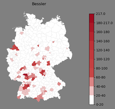 Relative Verteilung des Namens Bessler (1996)Direkt zur Karte Die Farbskala zeigt die Anzahl von "Bessler" bezogen auf je 1 Million Einträge. |