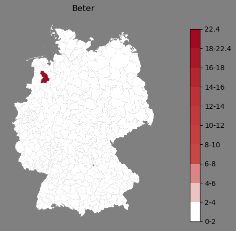 Relative Verteilung des Namens Beter (1996)Direkt zur Karte Die Farbskala zeigt die Anzahl von "Beter" bezogen auf je 1 Million Einträge. |