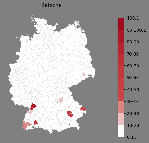 Relative Verteilung des Namens Betsche (1996)Direkt zur Karte Die Farbskala zeigt die Anzahl von "Betsche" bezogen auf je 1 Million Einträge. |