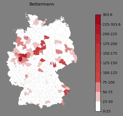 Absolute Verteilung des Namens Bettermann (1890)Direkt zur Karte Absolute Verteilung des Namens "Bettermann" um 1890 im damaligen Deutschen Reich Sie können die Karte innerhalb des Fensters zoomen und verschieben. |