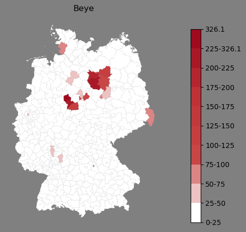 Relative Verteilung des Namens Beye (1996)Direkt zur Karte Die Farbskala zeigt die Anzahl von "Beye" bezogen auf je 1 Million Einträge. |