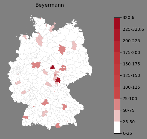 Absolute Verteilung des Namens Beyermann (1890)Direkt zur Karte Absolute Verteilung des Namens "Beyermann" um 1890 im damaligen Deutschen Reich Sie können die Karte innerhalb des Fensters zoomen und verschieben. |