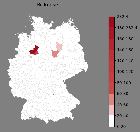 Relative Verteilung des Namens Bicknese (1996)Direkt zur Karte Die Farbskala zeigt die Anzahl von "Bicknese" bezogen auf je 1 Million Einträge. |