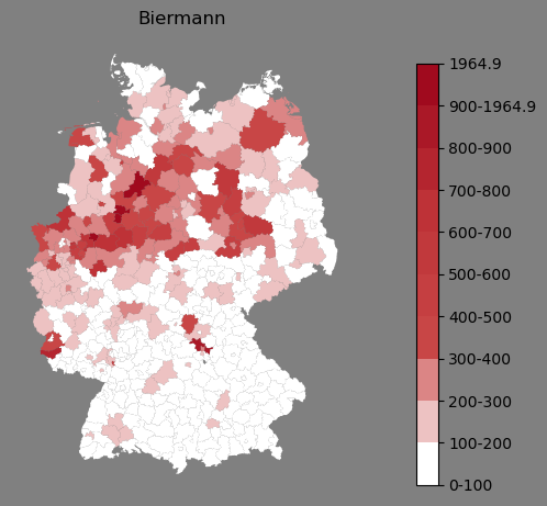 Absolute Verteilung des Namens Biermann (1890)Direkt zur Karte Absolute Verteilung des Namens "Biermann" um 1890 im damaligen Deutschen Reich Sie können die Karte innerhalb des Fensters zoomen und verschieben. |