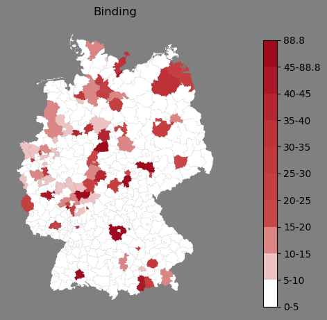 Relative Verteilung des Namens Binding (1996)Direkt zur Karte Die Farbskala zeigt die Anzahl von "Binding" bezogen auf je 1 Million Einträge. |