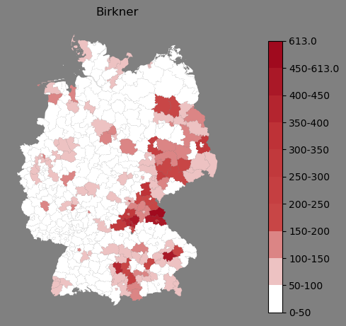 Absolute Verteilung des Namens Birkner (1890)Direkt zur Karte Absolute Verteilung des Namens "Birkner" um 1890 im damaligen Deutschen Reich Sie können die Karte innerhalb des Fensters zoomen und verschieben. |