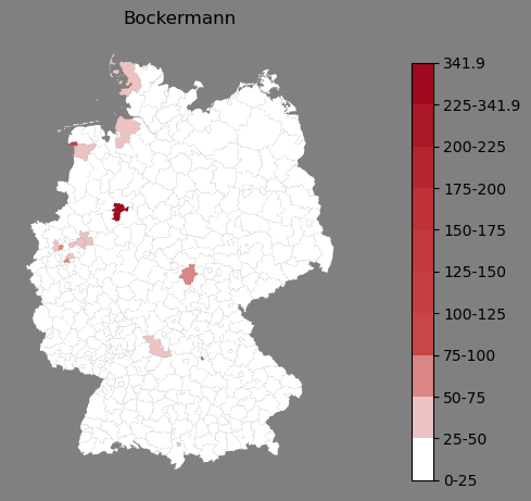 Absolute Verteilung des Namens Bockermann (1890)Direkt zur Karte Absolute Verteilung des Namens "Bockermann" um 1890 im damaligen Deutschen Reich Sie können die Karte innerhalb des Fensters zoomen und verschieben. |