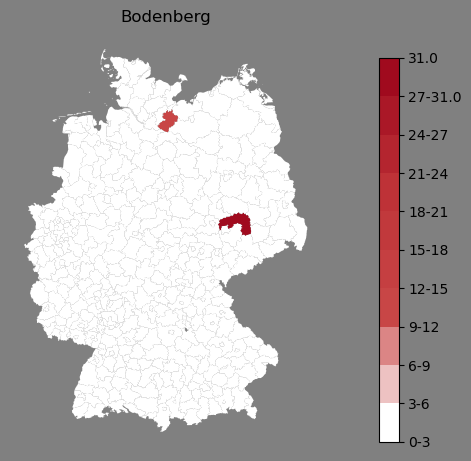 Relative Verteilung des Namens Bodenberg (1996)Direkt zur Karte Die Farbskala zeigt die Anzahl von "Bodenberg" bezogen auf je 1 Million Einträge. |