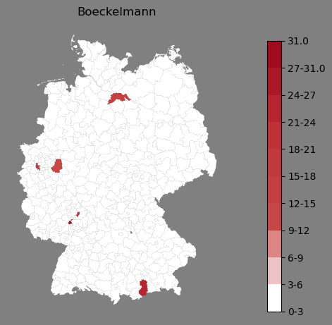 Relative Verteilung des Namens Boeckelmann (1996)Direkt zur Karte Die Farbskala zeigt die Anzahl von "Boeckelmann" bezogen auf je 1 Million Einträge. |